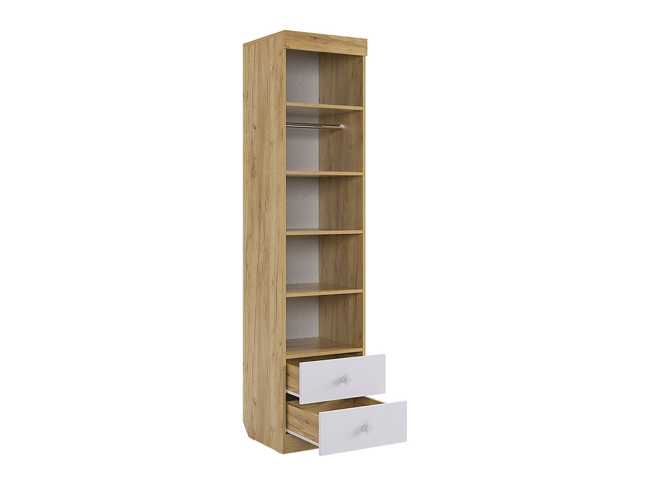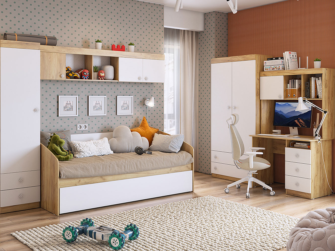 В наборе предусмотрены практичные элементы для учебы и отдыха. Комбинация распашных шкафов и выдвижных ящиков создаст продуманные места для хранения. Матовые фасады нетребовательны в уходе.