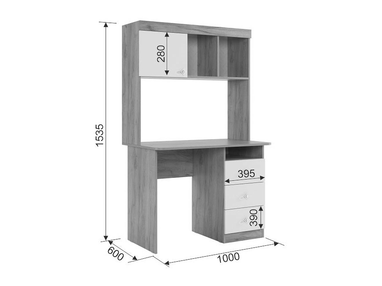 Письменный стол: 154 х 100 х 60 см.