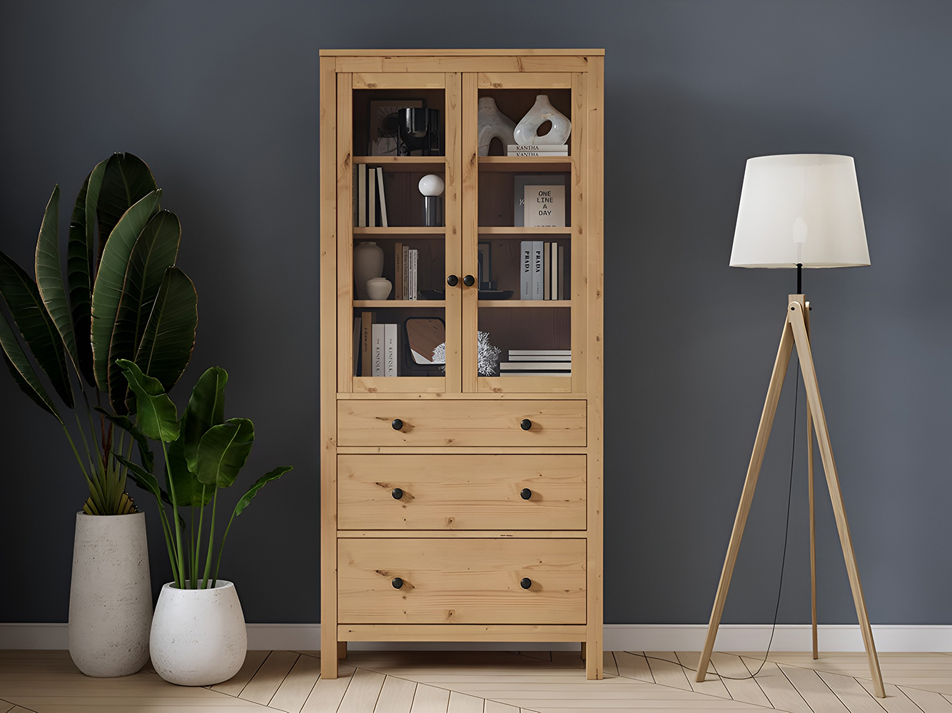 На полках удачно смотрятся посуда, книги и декор. Прозрачное стекло позволяет рассмотреть содержимое, при этом бережно защищает его от пыли. Шкаф выполнен из массива дерева, поэтому смотрится особенно эстетично.