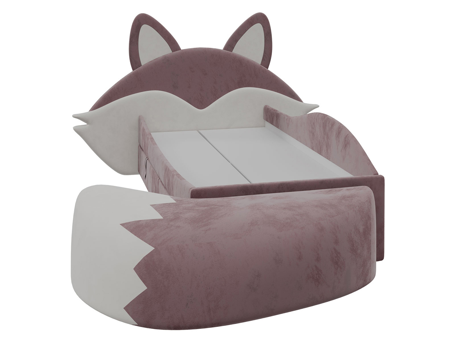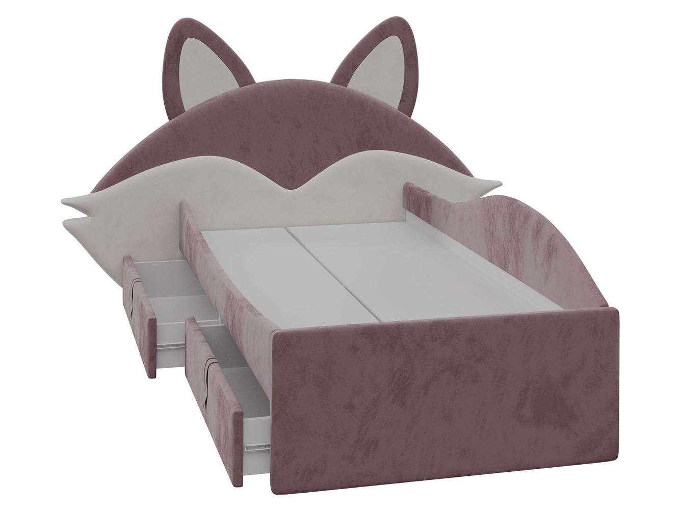 Зона сна представлена кроватью с оригинальным высоким изголовьем и ящиками, а игровая — функциональной конструкцией с мягким уютным местом для отдыха и полками, где можно разместить книги и канцелярские принадлежности.