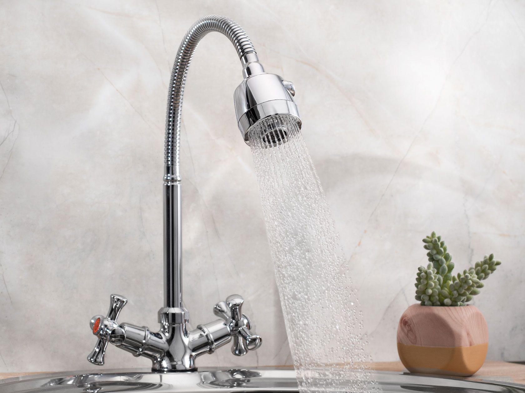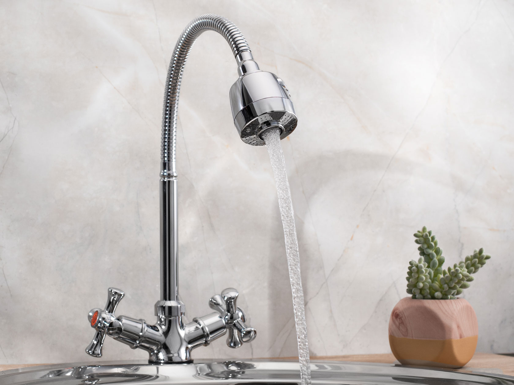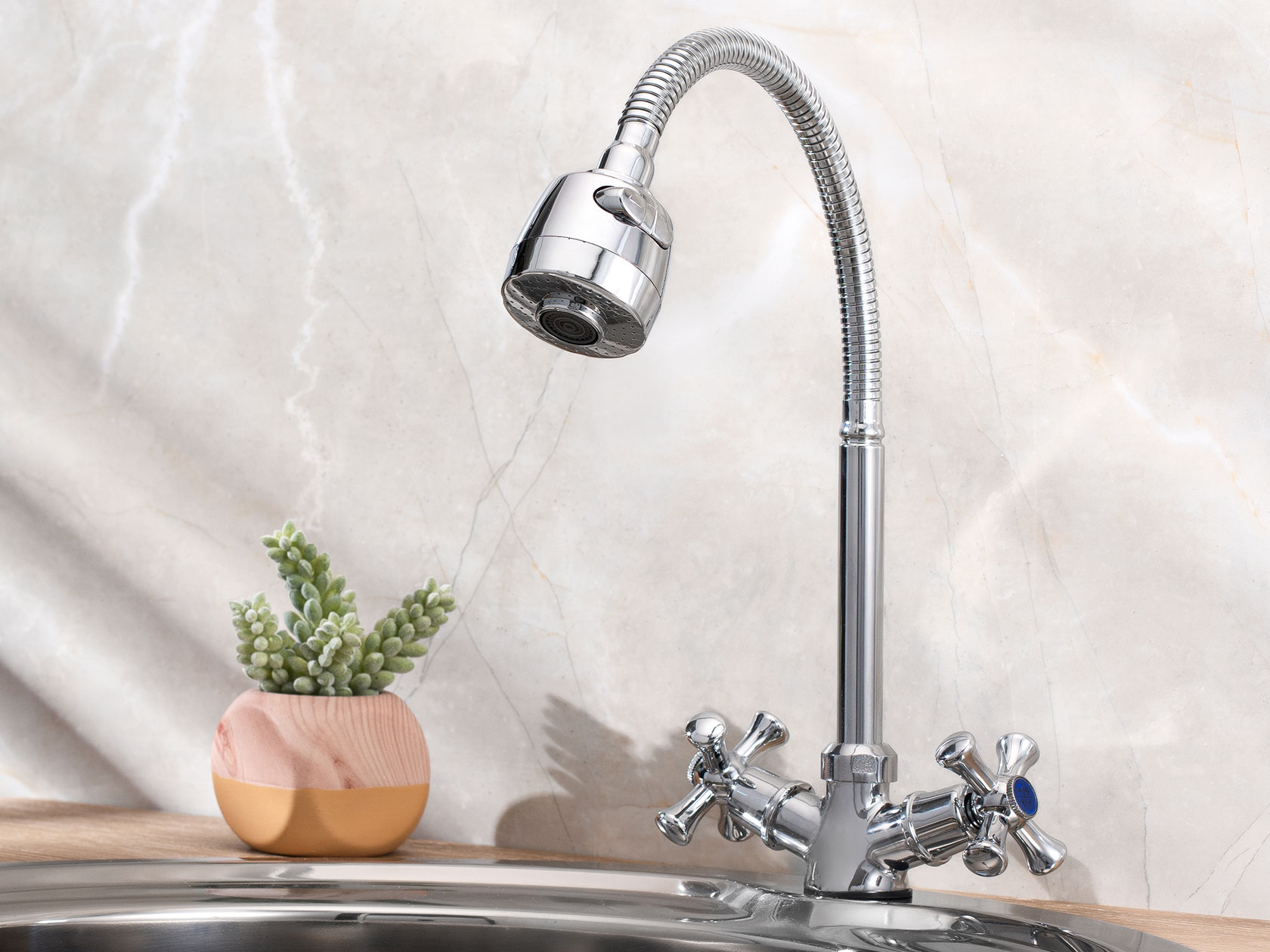 Удобная высота излива подходит для мытья посуды, овощей и фруктов, а также уборки на кухне и наполнения емкостей. Гальваническое покрытие придает особую устойчивость к повреждениям.