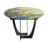 Поверхность с покрытием, имитирующим мрамор, не имеет острых углов и хорошо сочетается с разными стилями меблировки. Опоры оригинальной формы станут ярким дополнением интерьера. При необходимости модель легко раскладывается, позволяя комфортно разместить компанию из нескольких человек.