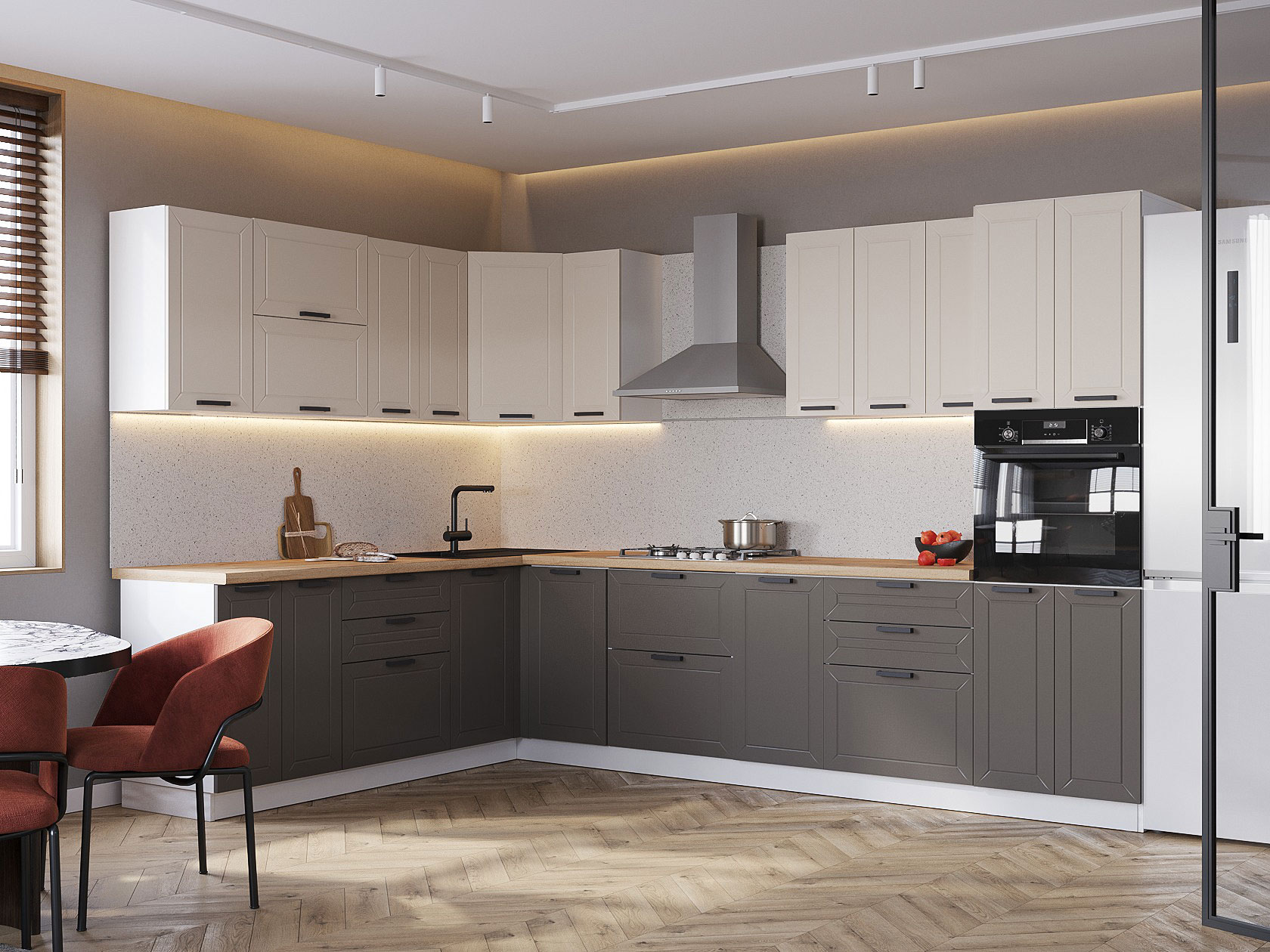 Элементы создают удобную систему хранения поварской утвари и продуктов. Фасады украшены декоративной фрезеровкой. Контрастные ручки расставляют акценты и обеспечивают комфорт при эксплуатации мебели.