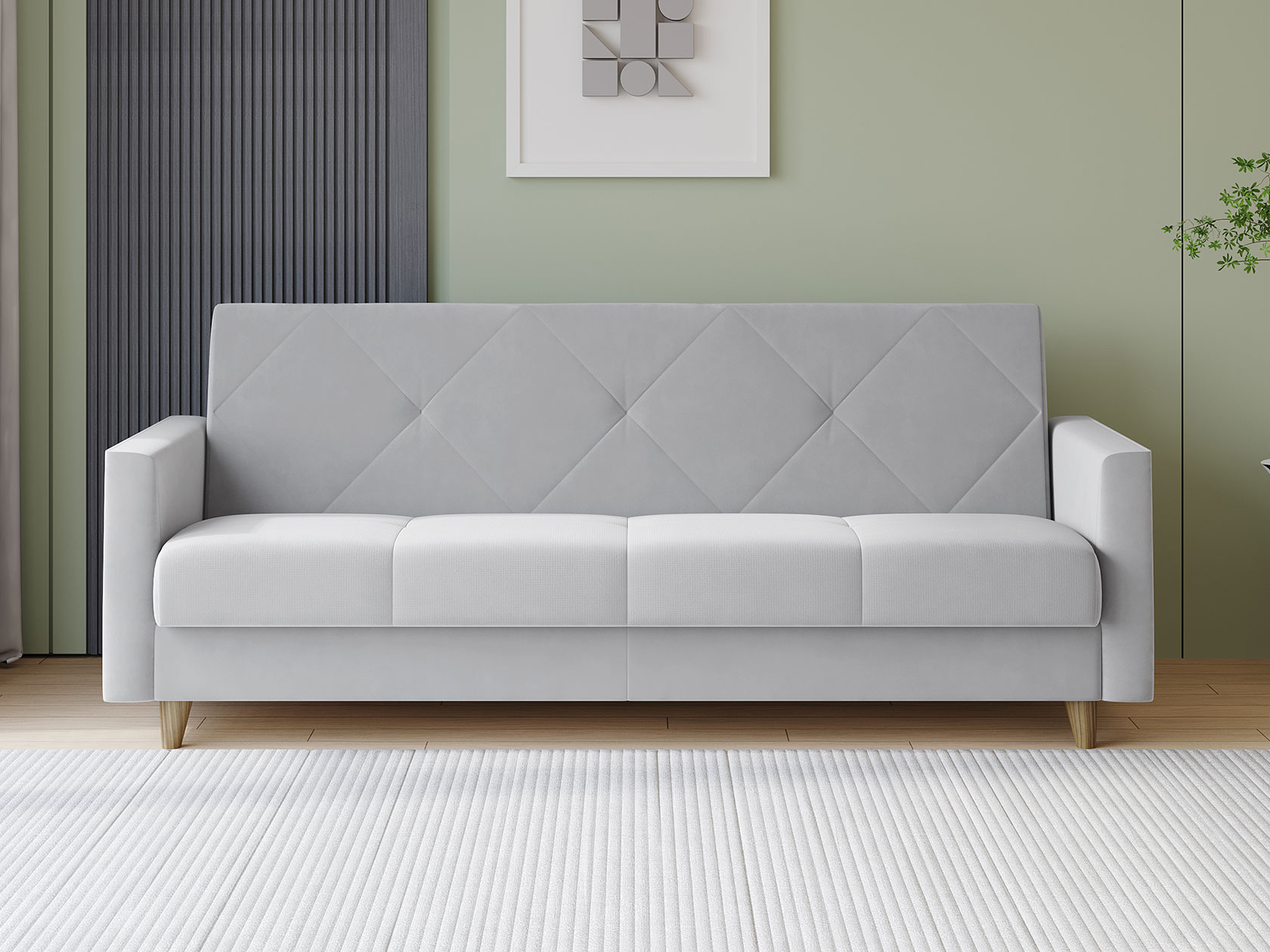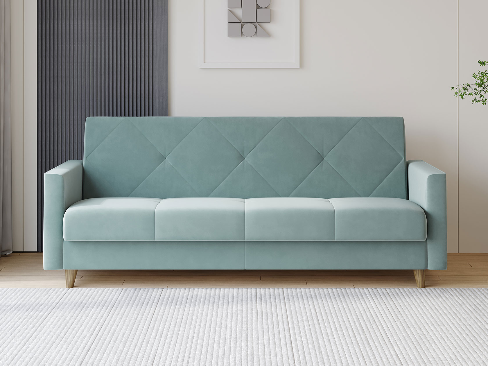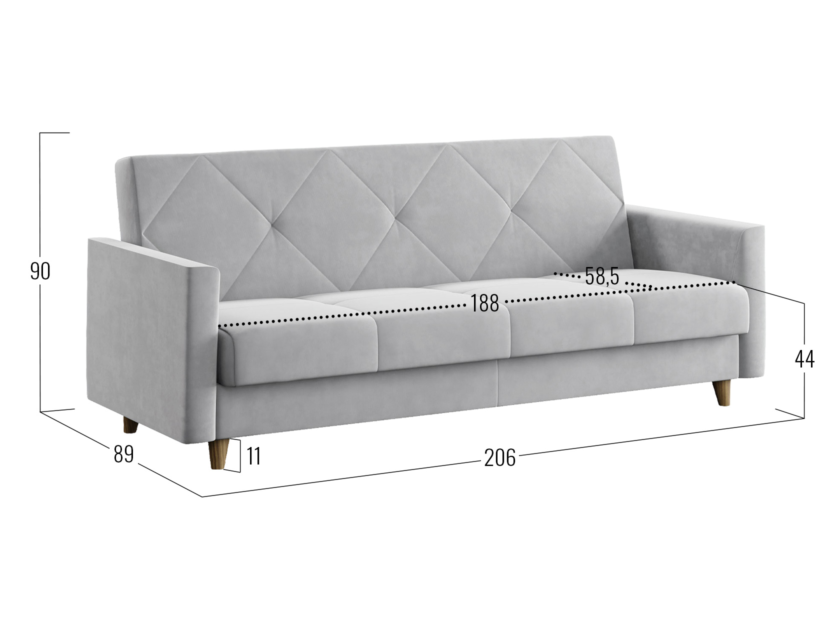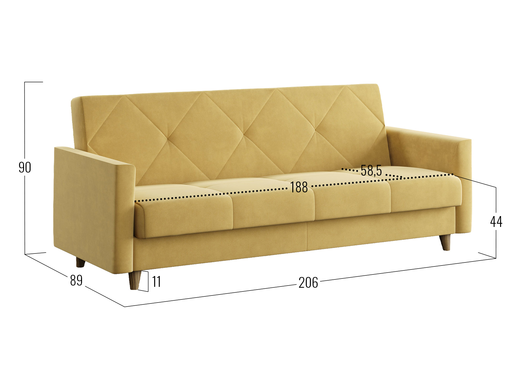 Днем модель станет комфортным местом для отдыха, а ночью легко трансформируется в удобную кровать. В дизайне сделан акцент на идеальную симметрию и строгость линий. Небольшие ножки и декоративная строчка добавляют стильных акцентов обстановке, а бельевой короб позволяет хранить в быстром доступе постельные принадлежности.