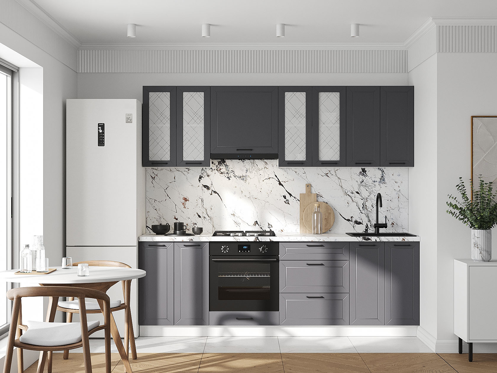 Набор элементов поможет организовать удобное хранение и создаст комфортное пространство для приготовления блюд. Верхний ряд мебели украшен стеклянными дверцами с ромбовидным узором, что добавляет обстановке уютные акценты.
