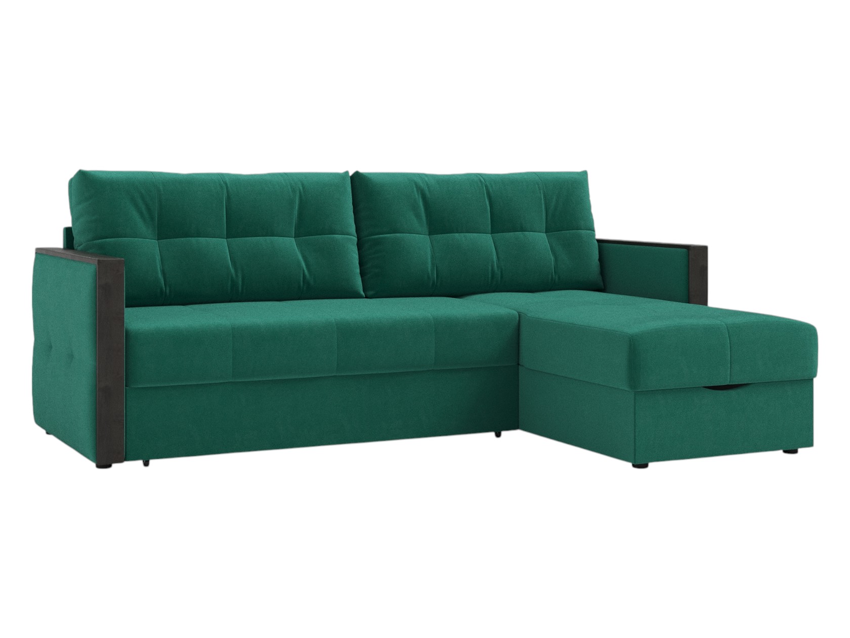 Узкие подлокотники с накладками подойдут в качестве подставки для пульта или смартфона, а приспинные подушки — для регулировки глубины посадки. В разложенном виде модель образует комфортное спальное место с небольшой спинкой, которая защищает от соприкосновения со стеной. Для постельных принадлежностей предусмотрен специальный бельевой короб. В выкатной части и оттоманке установлен независимый пружинный блок.