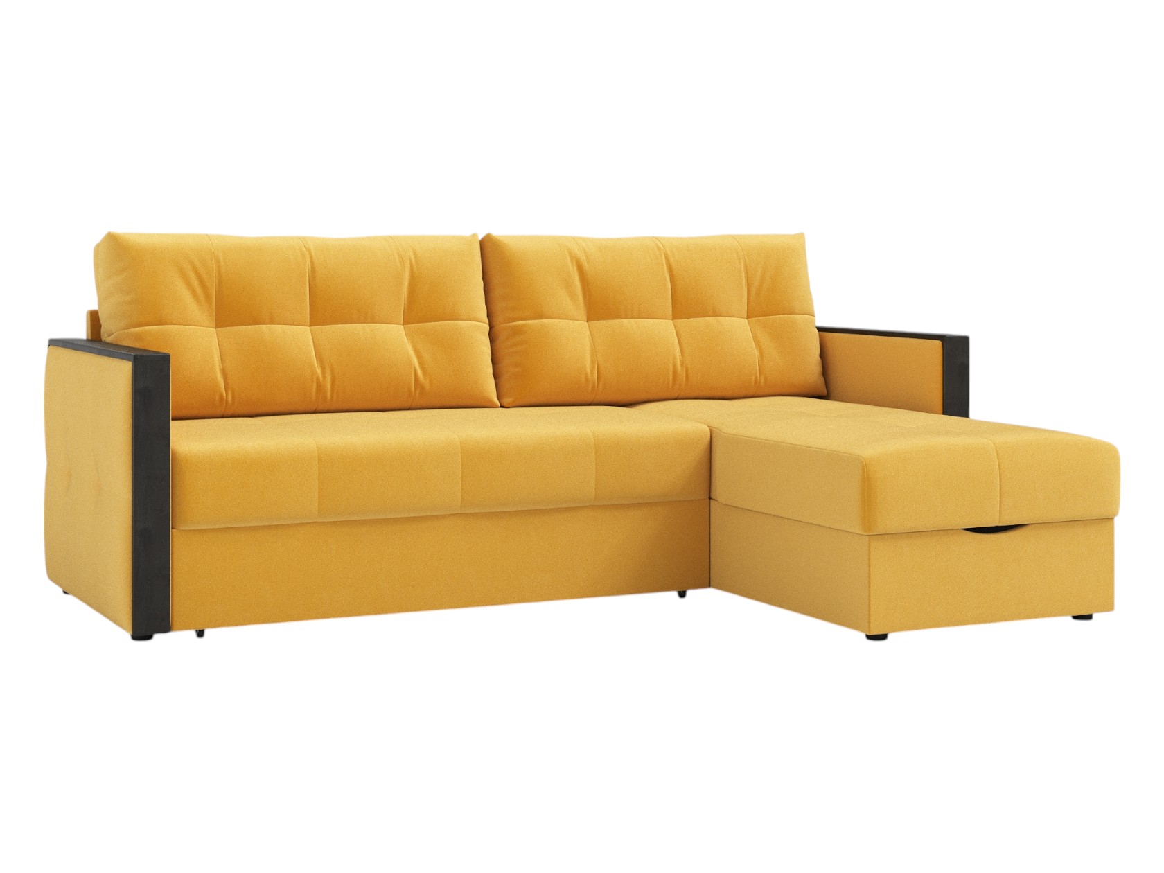 Узкие подлокотники с накладками подойдут в качестве подставки для пульта или смартфона, а приспинные подушки — для регулировки глубины посадки. В разложенном виде модель образует комфортное спальное место с небольшой спинкой, которая защищает от соприкосновения со стеной. Для постельных принадлежностей предусмотрен специальный бельевой короб. В выкатной части и оттоманке установлен независимый пружинный блок.