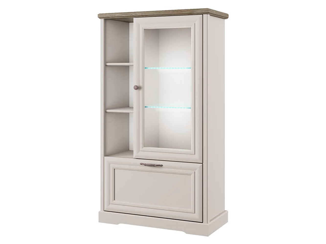 Мебель позволяет аккуратно разместить мультимедийную технику, книги, документы и другие нужные вещи. Декоративные планки в виде объемных рамок и акцентные ручки придают фасадам по-настоящему элегантный вид. Шкафы-витрины с возможностью выбора подсветки создают особую изюминку интерьера.