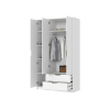 Внутреннее наполнение позволяет разместить одежду на вешалках и воспользоваться полками для сложенной одежды. В выдвижных ящиках удобно хранить обувь, сумки и аксессуары. В дизайне сделан акцент на простые формы и строгие линии. Фасады без внешней фурнитуры открываются за специальную выемку.