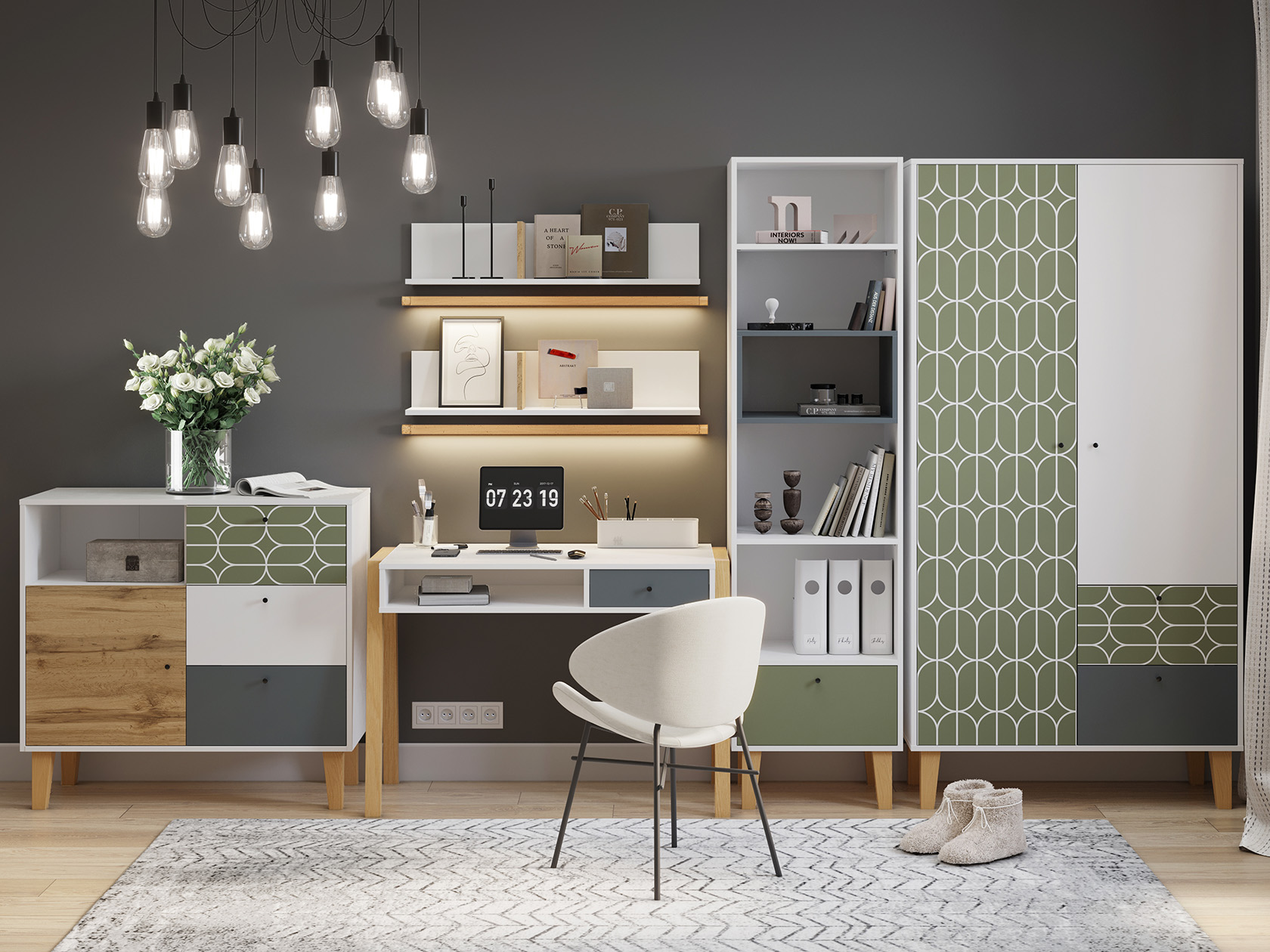 Письменный стол обеспечит место для домашних занятий и творчества. Продуманные элементы для хранения позволят аккуратно распределить одежду, обувь, игрушки и книги. Современный дизайн с контрастными фасадами создает стильный облик комнаты.