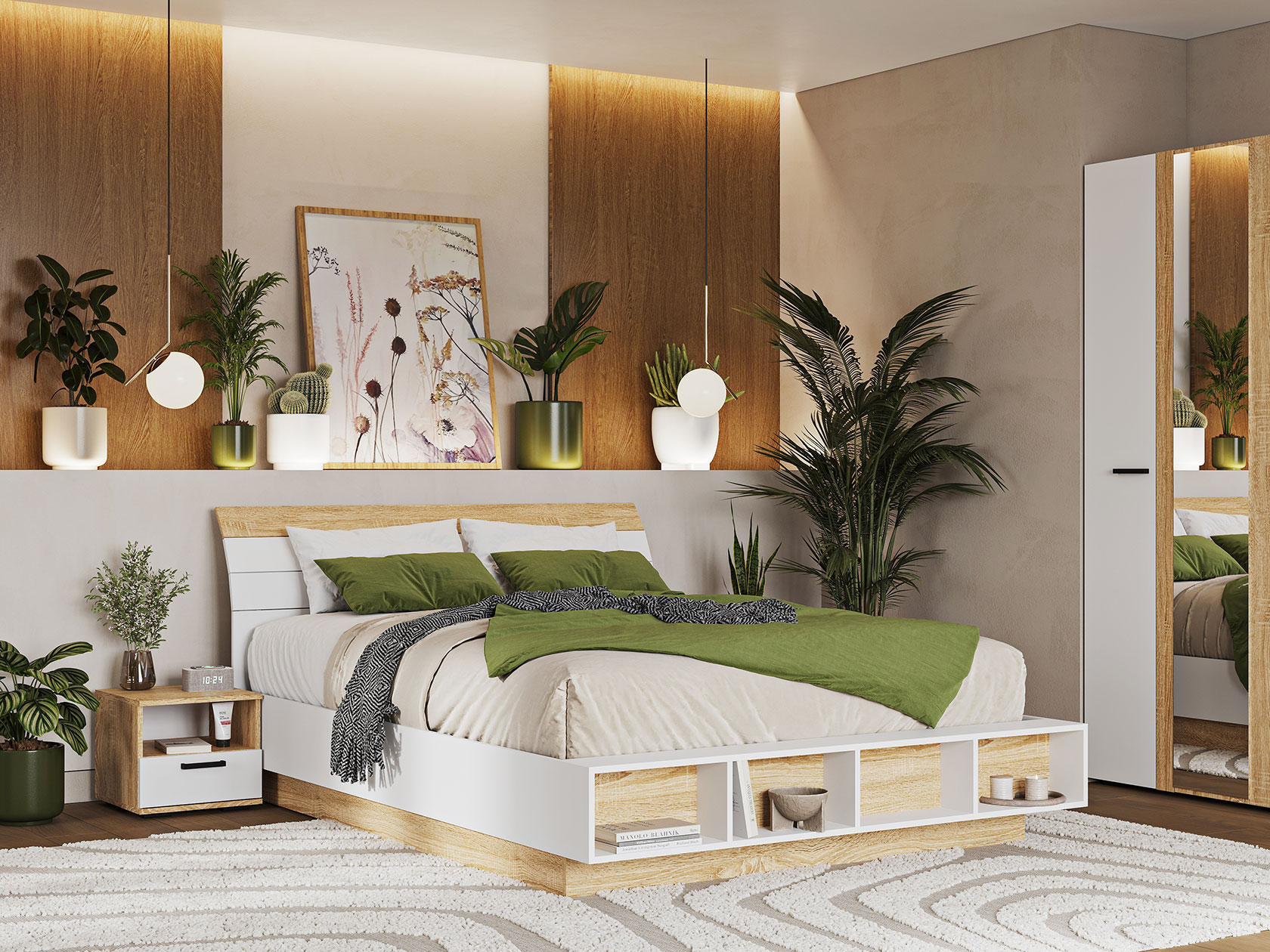 Практичная система хранения поможет разместить всё необходимое и легко поддерживать порядок в комнате. Сочетание матовых фасадов и древесных вставок создает приятную атмосферу, а открытые ниши позволяют разнообразить интерьер запоминающимися деталями.