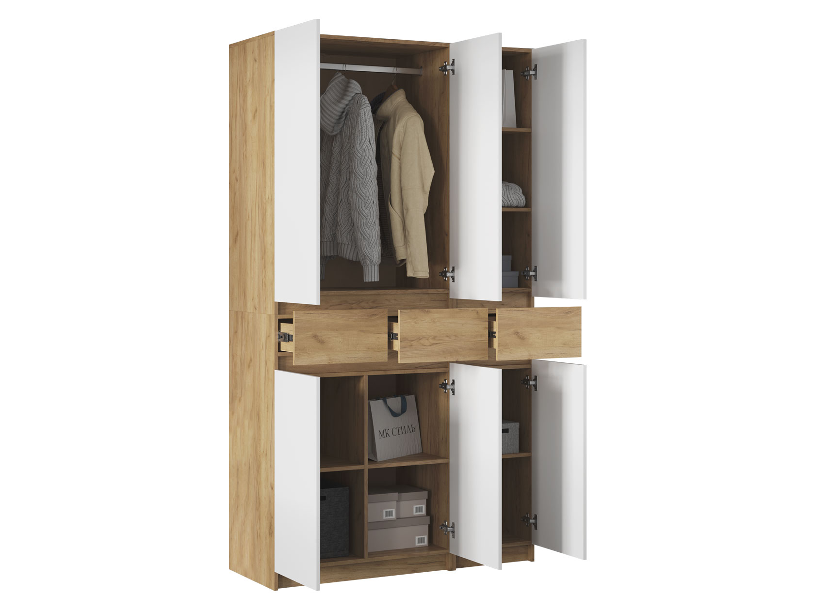 Разноплановые отделения позволяют разделить одежду по категориям. Текстура дерева и светлые фасады подходят практически для любого интерьера.