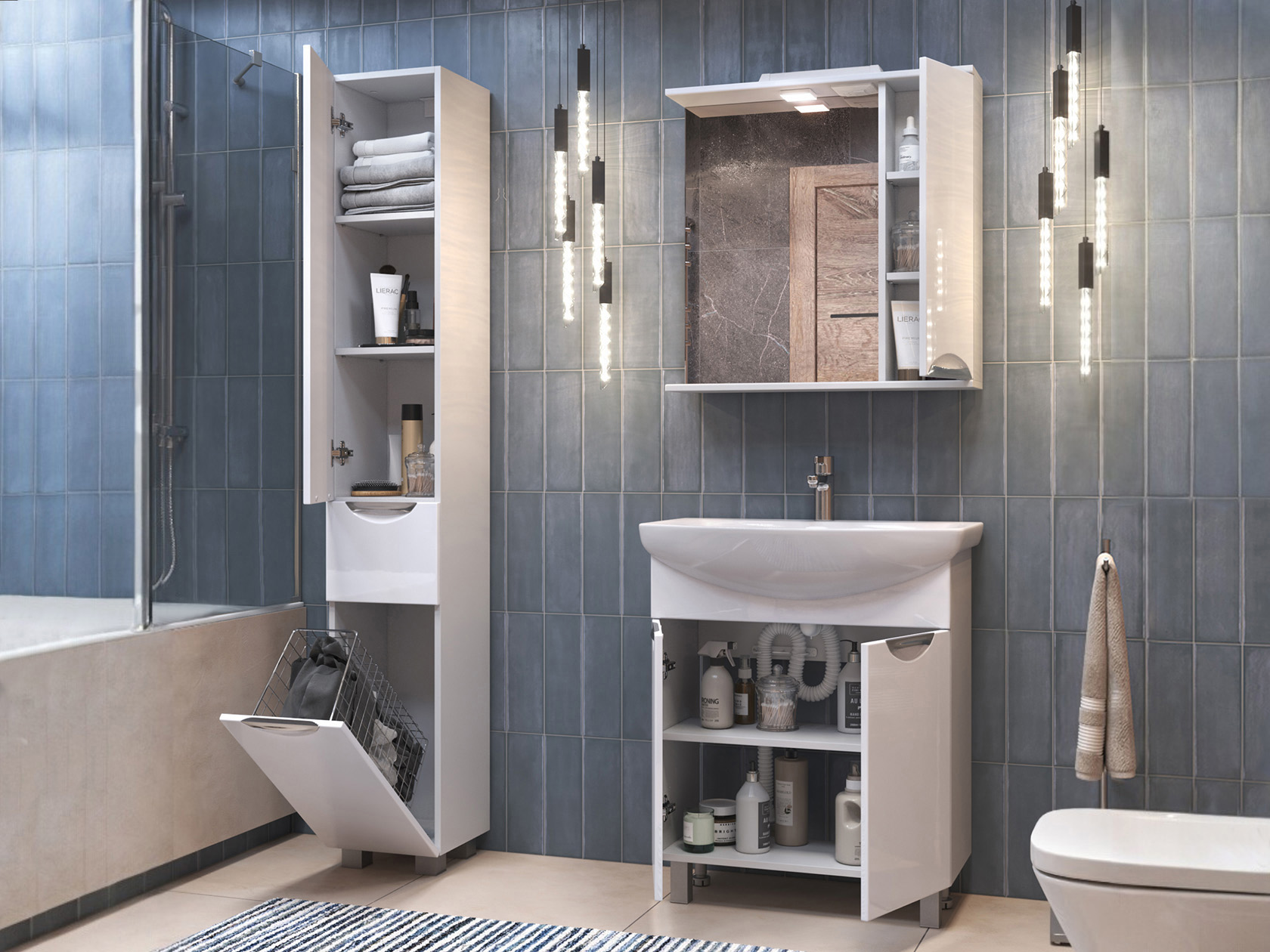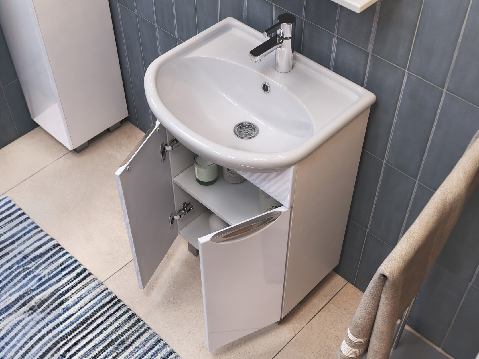 Внутри находится полка, которая делит пространство на равные части, что позволяет распределить моющие средства и бытовую химию. Петли с доводчиком обеспечивают плавное закрывание, а стильные хромированные ручки добавляют обстановке элегантности.