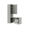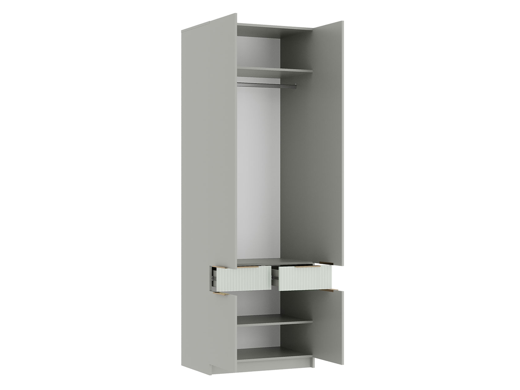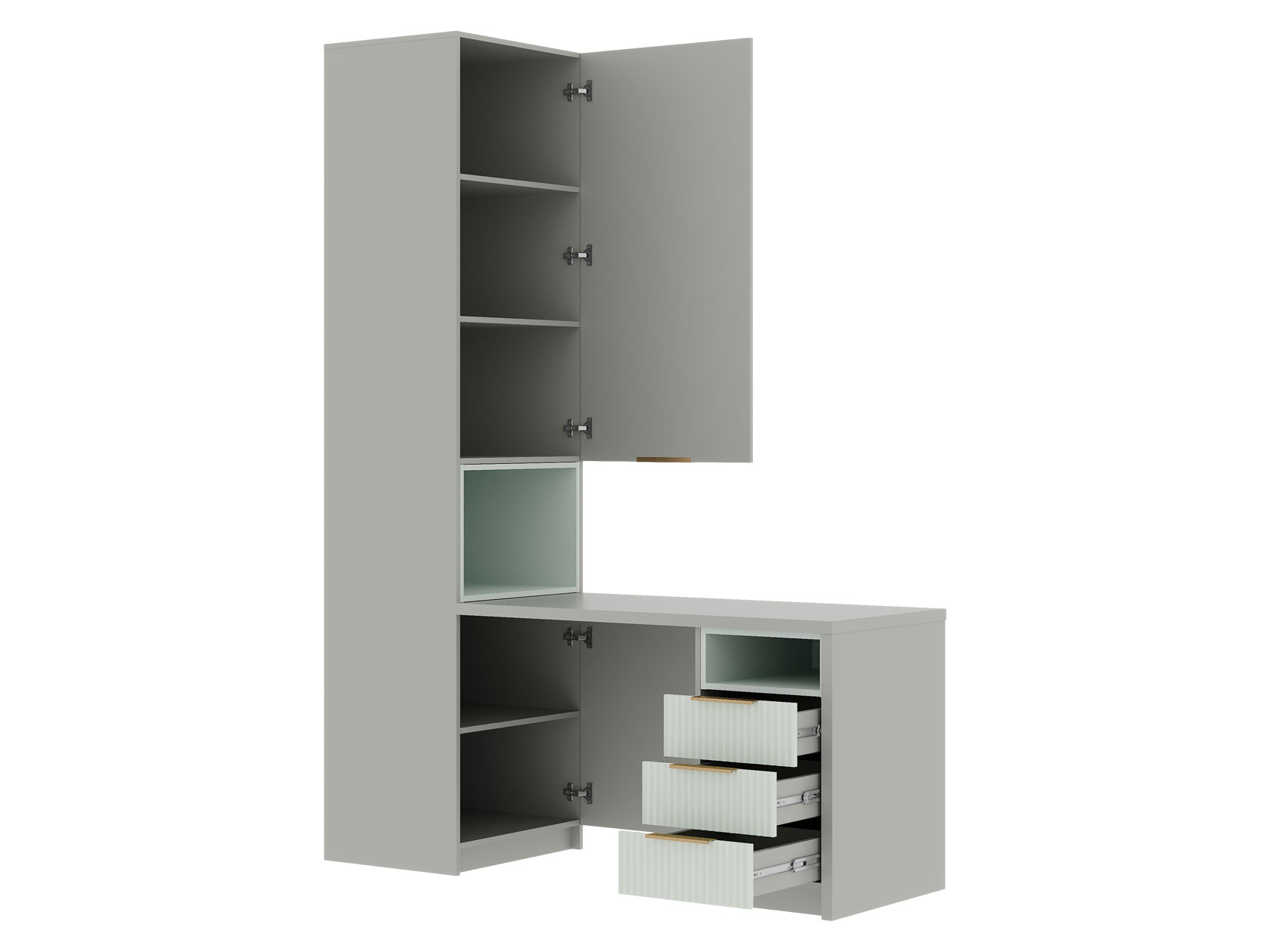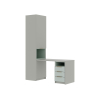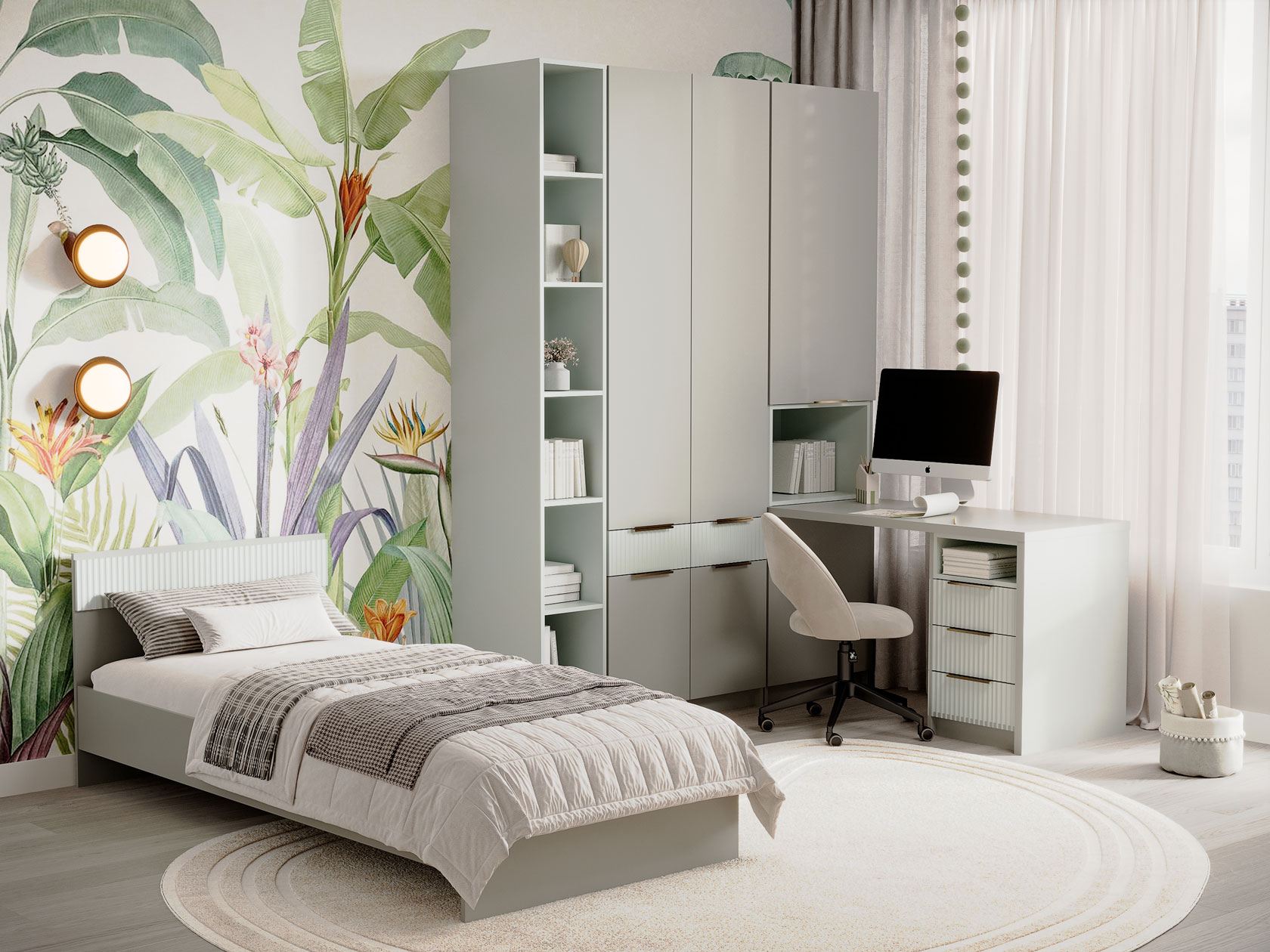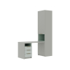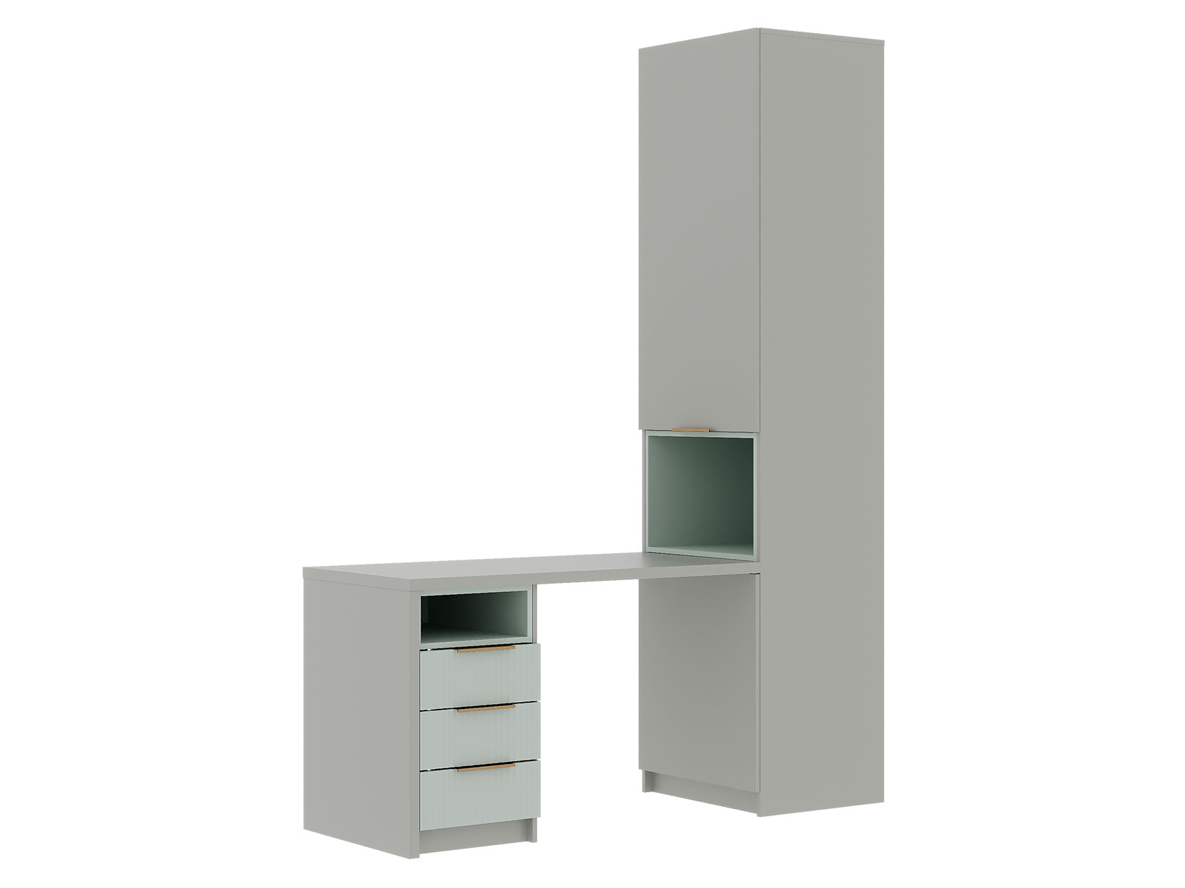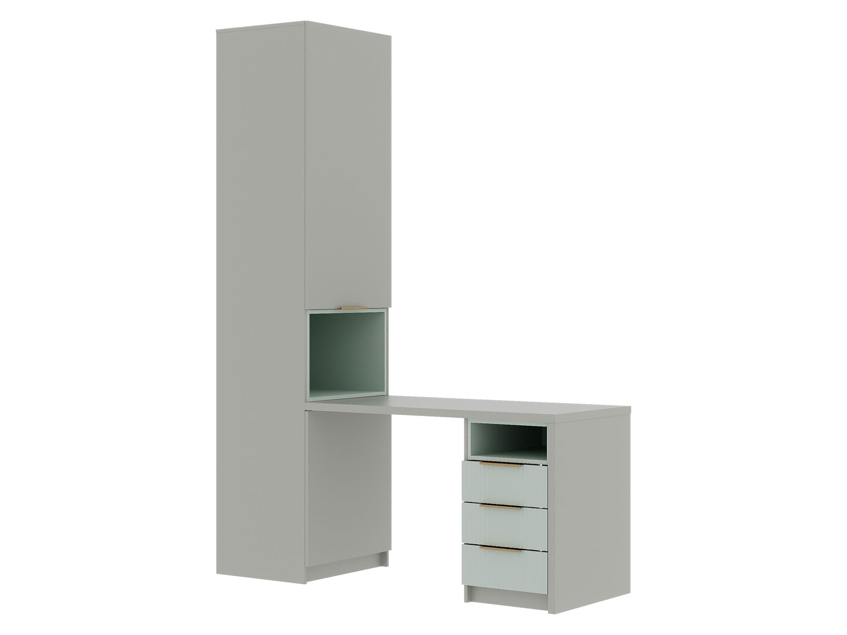 Для хранения одежды, игрушек и книг предусмотрена функциональная шкафная группа с удобными секциями. Рабочий уголок с просторным столом и тумбой — практичное решение для учебы и творчества. Стильные фасады с фрезеровкой наполняют пространство светом и создают уютную атмосферу.