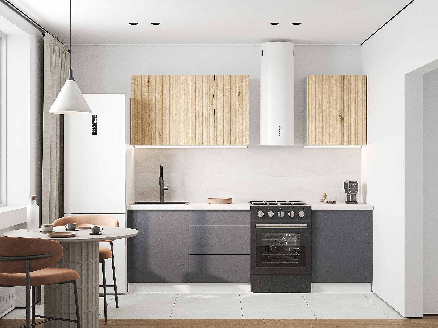 Компактный набор можно расположить вдоль одной стены и обустроить систему хранения продуктов, посуды и поварской утвари. Фасады с фрезеровкой устойчивы к влаге, ультрафиолету и мелким повреждениям.