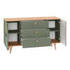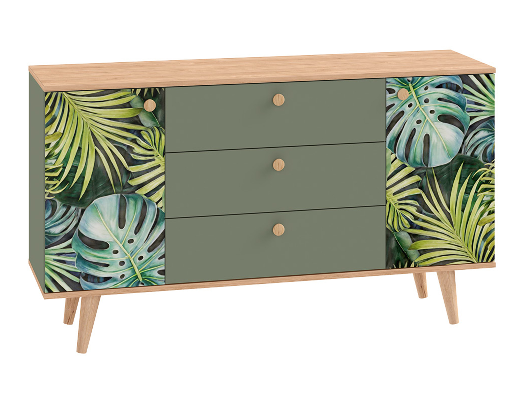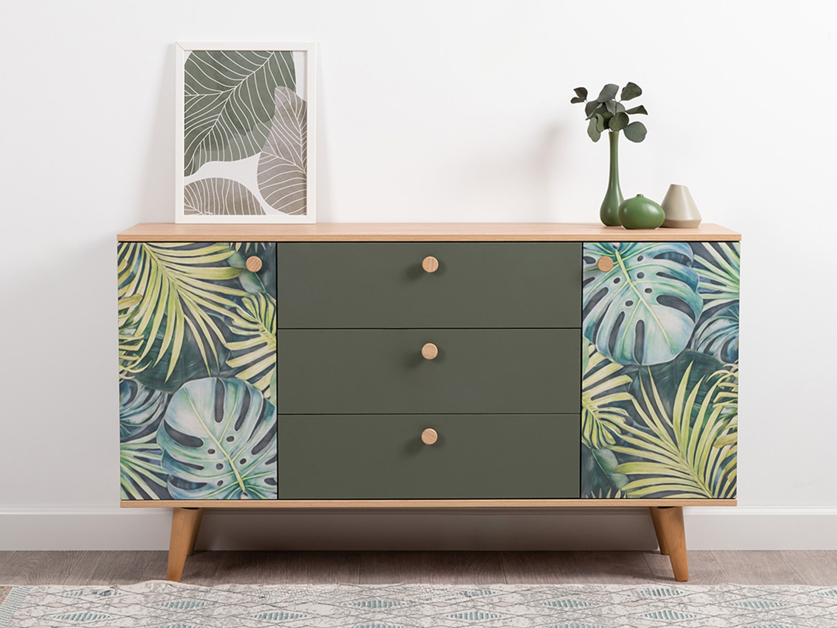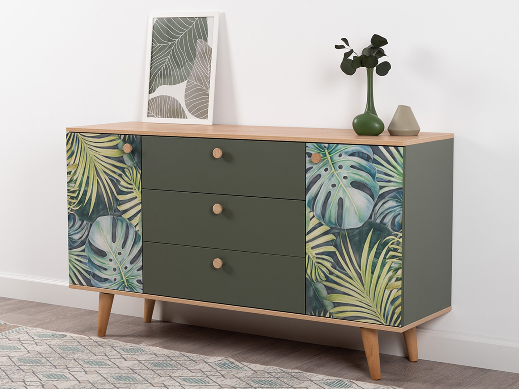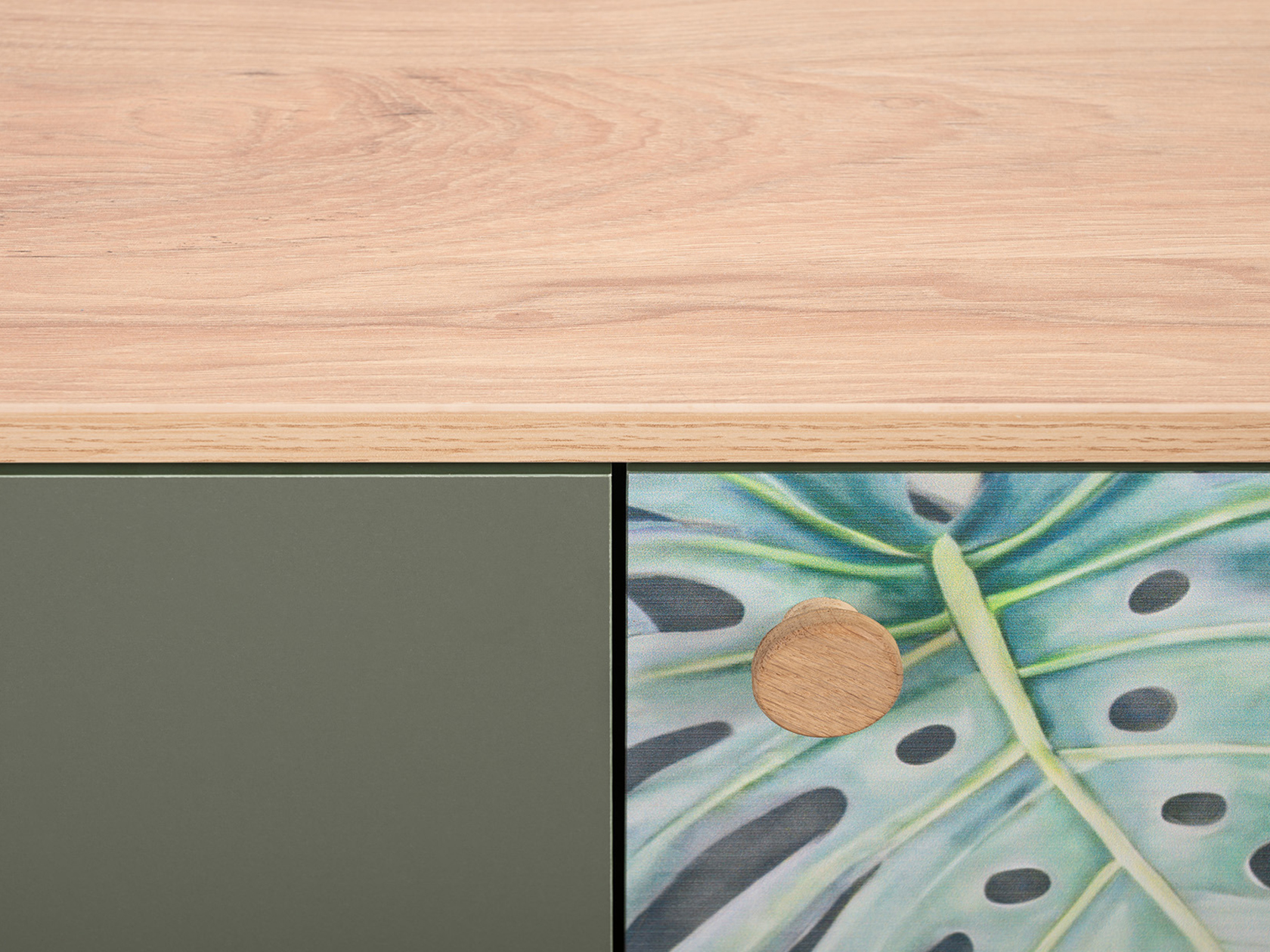 Ящики плавно открываются на полную глубину, позволяя быстрее находить нужную вещь. Благодаря доводчикам дверцы закрываются бесшумно и без лишних усилий. Ручки и опоры выполнены из натурального дерева, что обеспечивает долговечность мебели и гармонично сочетается с фотопечатью на фасадах. Растительный принт придает обстановке особые теплоту и уют.