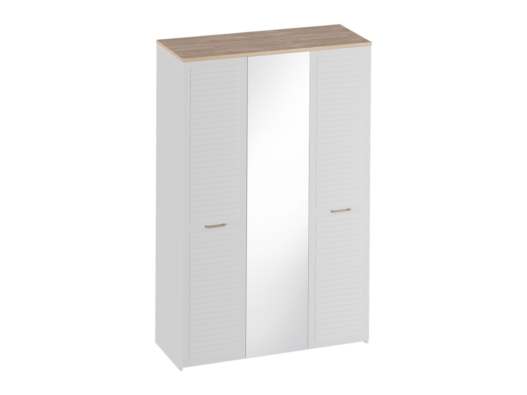 Внутреннее наполнение позволяет аккуратно разместить одежду из деликатных тканей, домашний трикотаж, коробки с обувью и аксессуары. Текстура дерева удачно сочетается с фрезеровкой и акцентными ручками золотистого оттенка. Полноразмерное зеркало делает комнату более освещенной и помогает оценить подобранный образ.