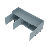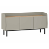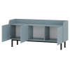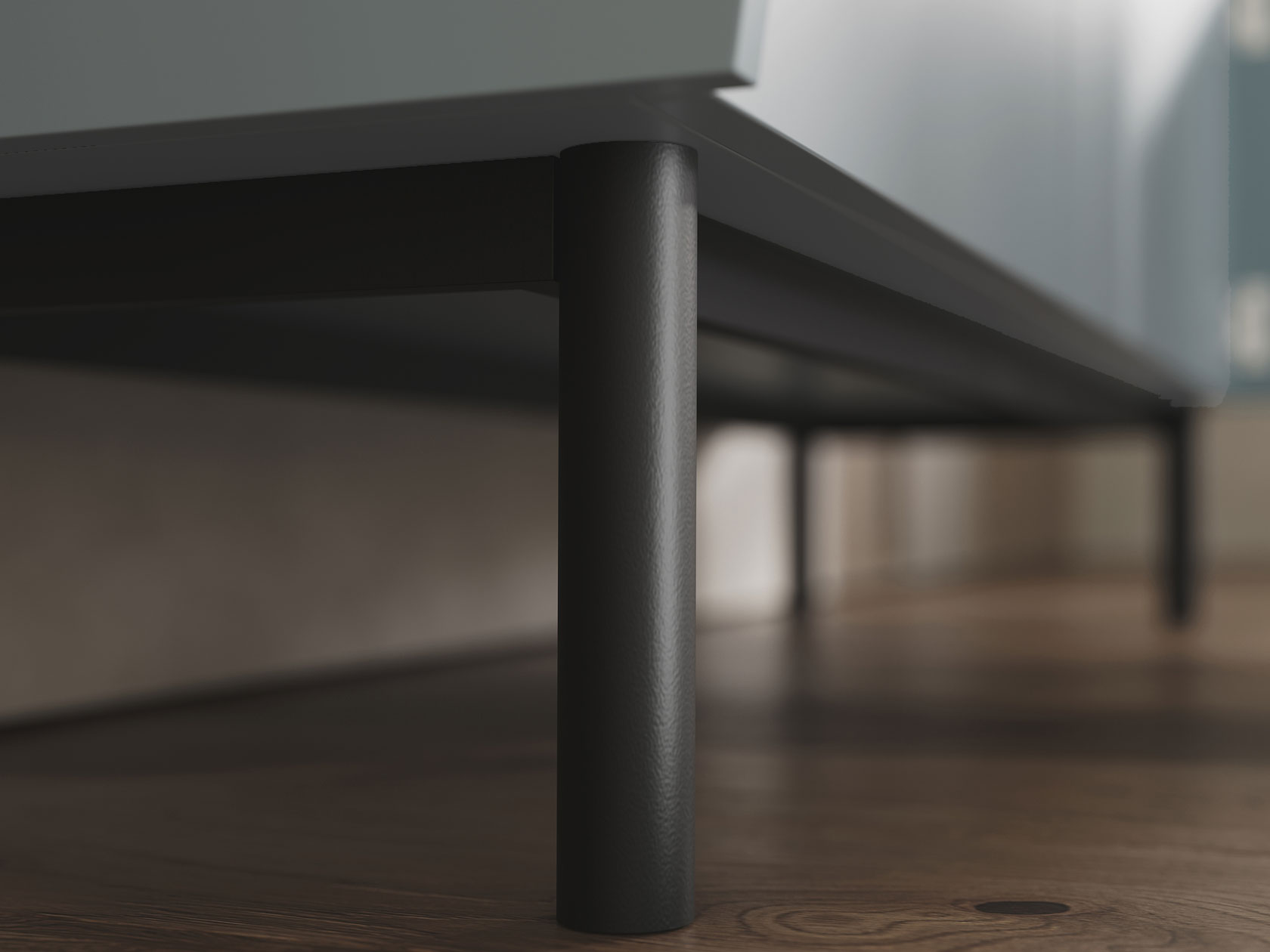 За распашными дверцами расположены три отдельные секции для хранения книг, одежды и различных предметов обихода. Поверхность с бортиками станет удобной площадкой для размещения телевизора. Высокие ножки добавляют интерьеру визуальной легкости, а отсутствие ручек создает минималистичный облик мебели.