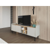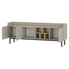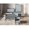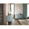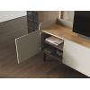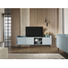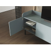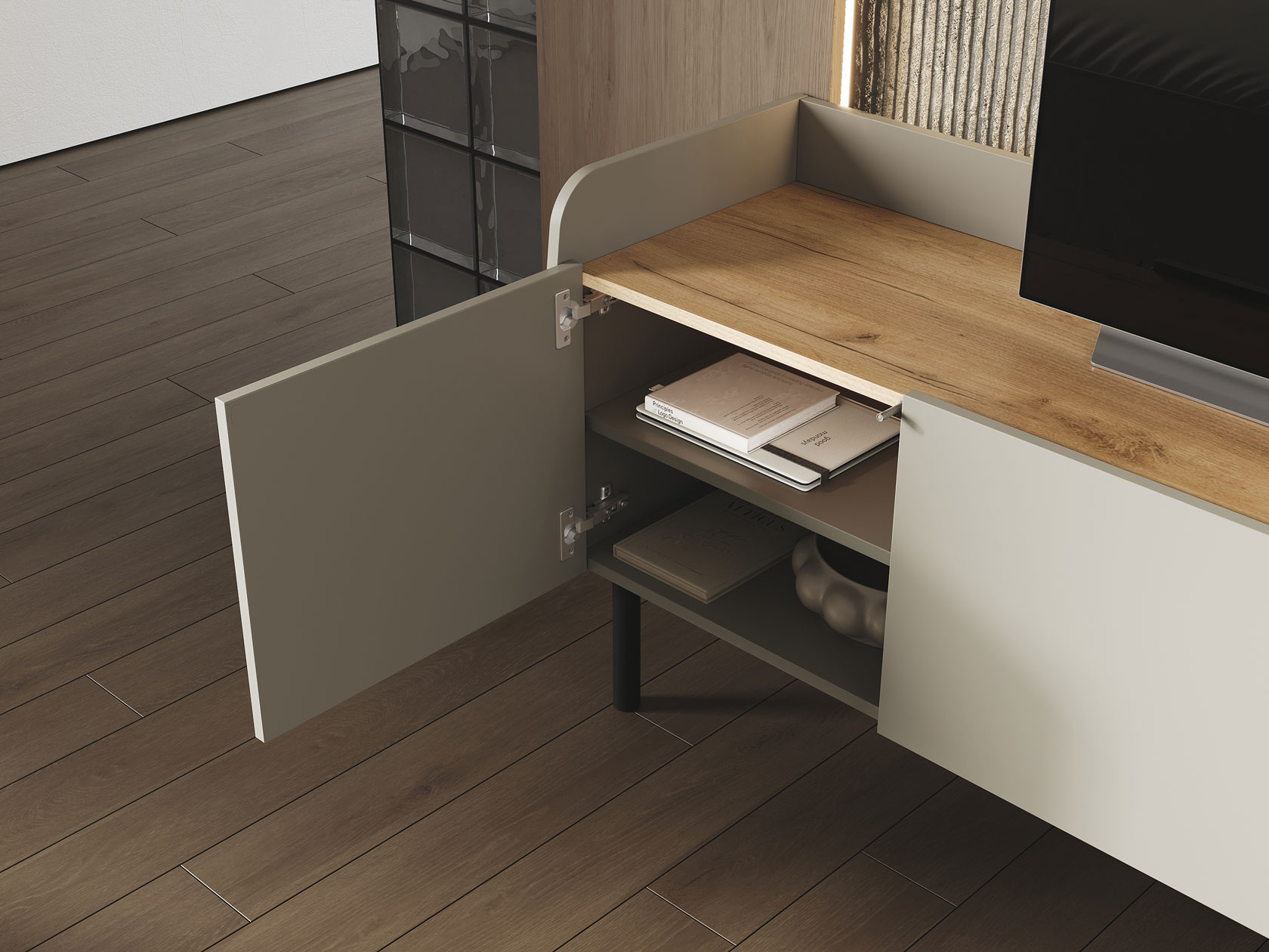За глухими фасадами можно спрятать личные вещи, а в открытых нишах — расположить декор. На поверхности найдется место для телевизора с широкой диагональю или осветительных приборов. Бортики добавляют модели уютные нотки, а высокие ножки облегчают уборку.