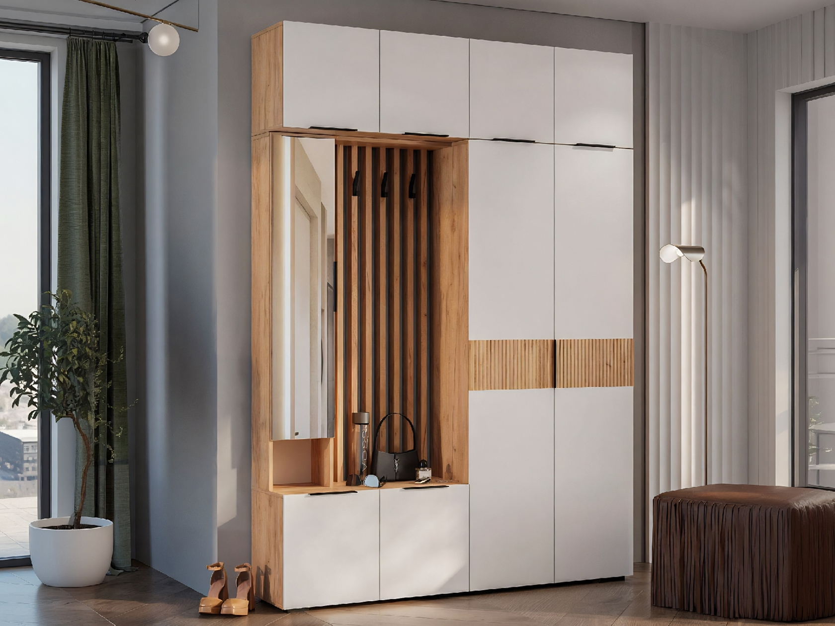Продуманный набор элементов включает всё, что необходимо для хранения одежды, обуви и различных мелочей. Закрытые отделения позволяют спрятать вещи от посторонних глаз и не захламлять интерьер. Зеркало на одном из фасадов — важная деталь любой входной зоны.