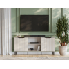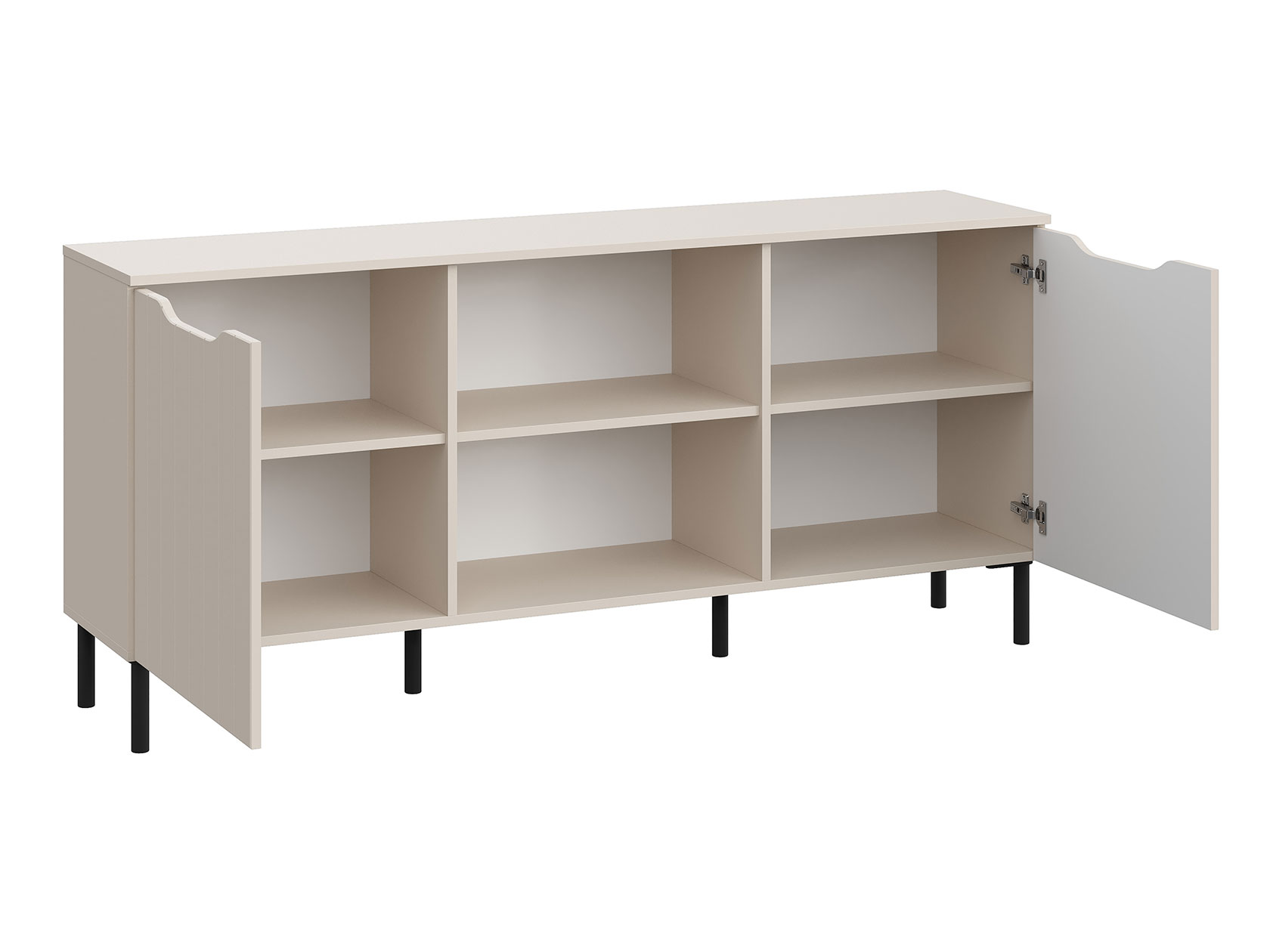 Боковые отделения с дверцами и открытые секции по центру позволят поддерживать порядок в комнате. Вертикальные линии на фасадах служат стильным декором. Модель можно подвесить на стену или установить на опоры. Высокие металлические ножки создают визуально легкий облик мебели.