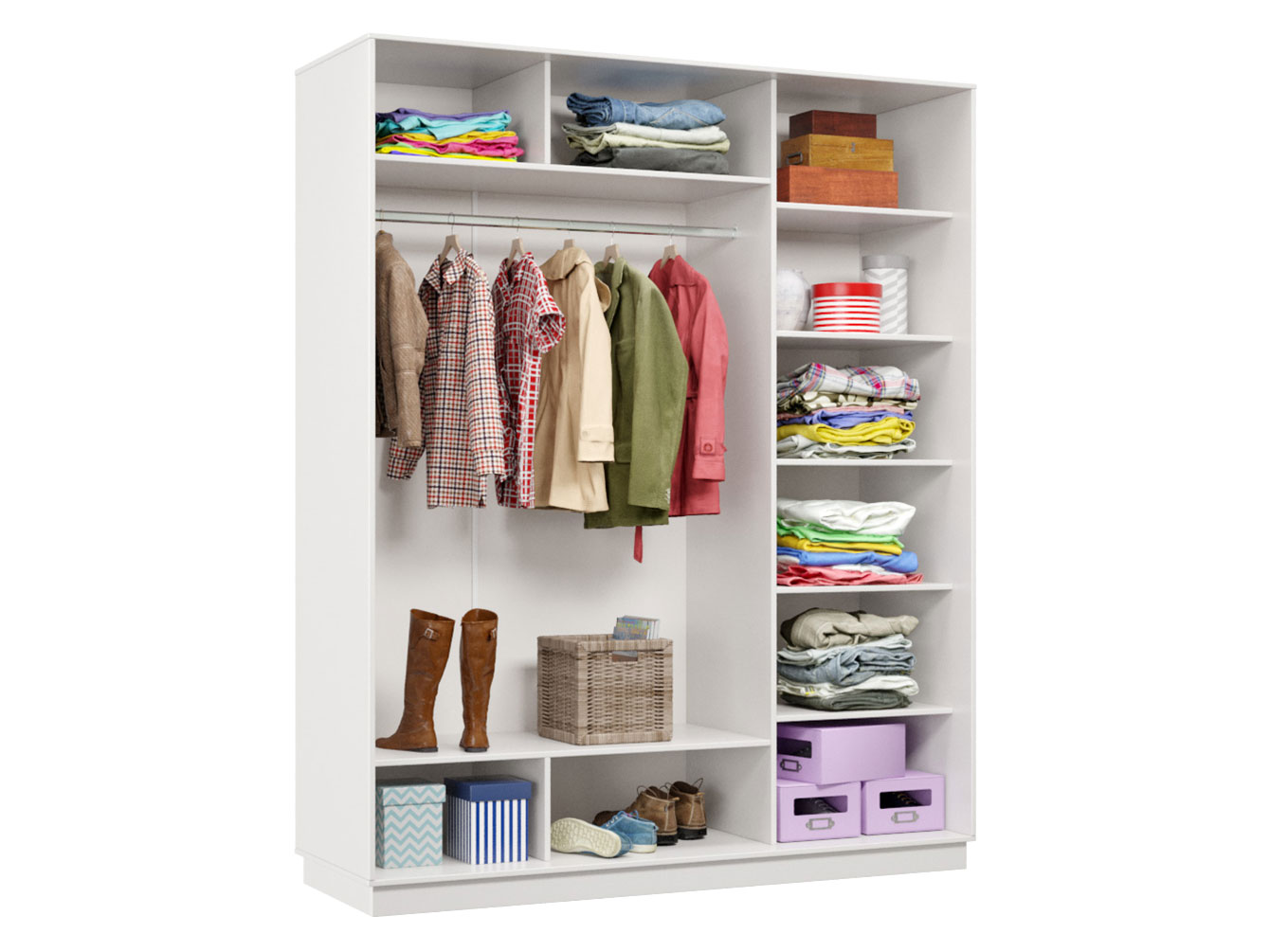 Лаконичный дизайн с гладкими фасадами и отсутствием лицевой фурнитуры легко интегрировать в разные стили меблировки. Внутри расположена большая секция со штангой для плечиков, а также ряд полок для домашнего текстиля и аксессуаров. Дверцы плавно и бесшумно передвигаются по однополосному треку, обеспечивая быстрый доступ к нужному отделению.