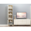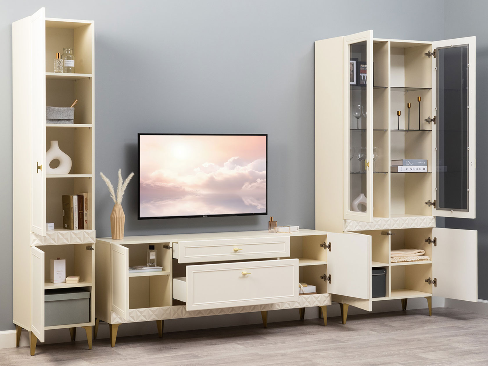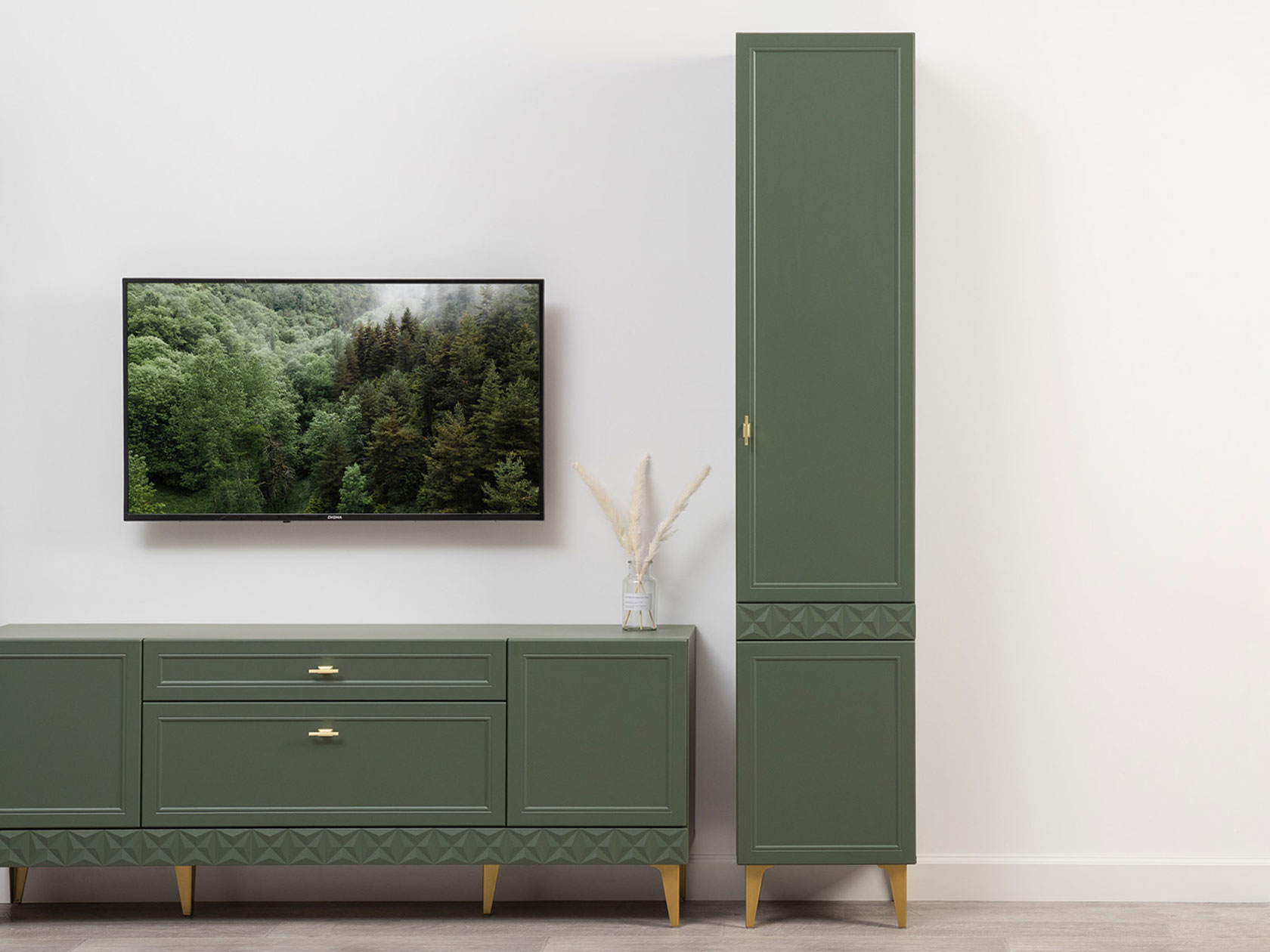 Компактная конструкция легко поместится в комнате с ограниченным пространством. Оригинальная фрезеровка на фасадах подчеркивает элегантный дизайн модели, а фурнитура и ножки в золотистом оттенке выступают небольшими акцентами интерьера.