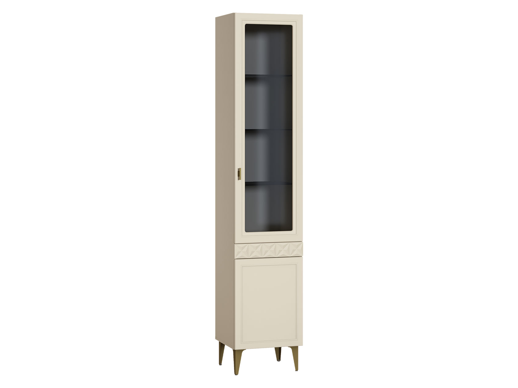 Фрезеровка на фасадах создает интересную фактуру. Матовая поверхность удачно маскирует частички пыли и отпечатки пальцев. Шкафы-витрины позволяют разместить на виду коллекционные вещи, книги или посуду. Качественная фурнитура обеспечивает комфортную эксплуатацию мебели.