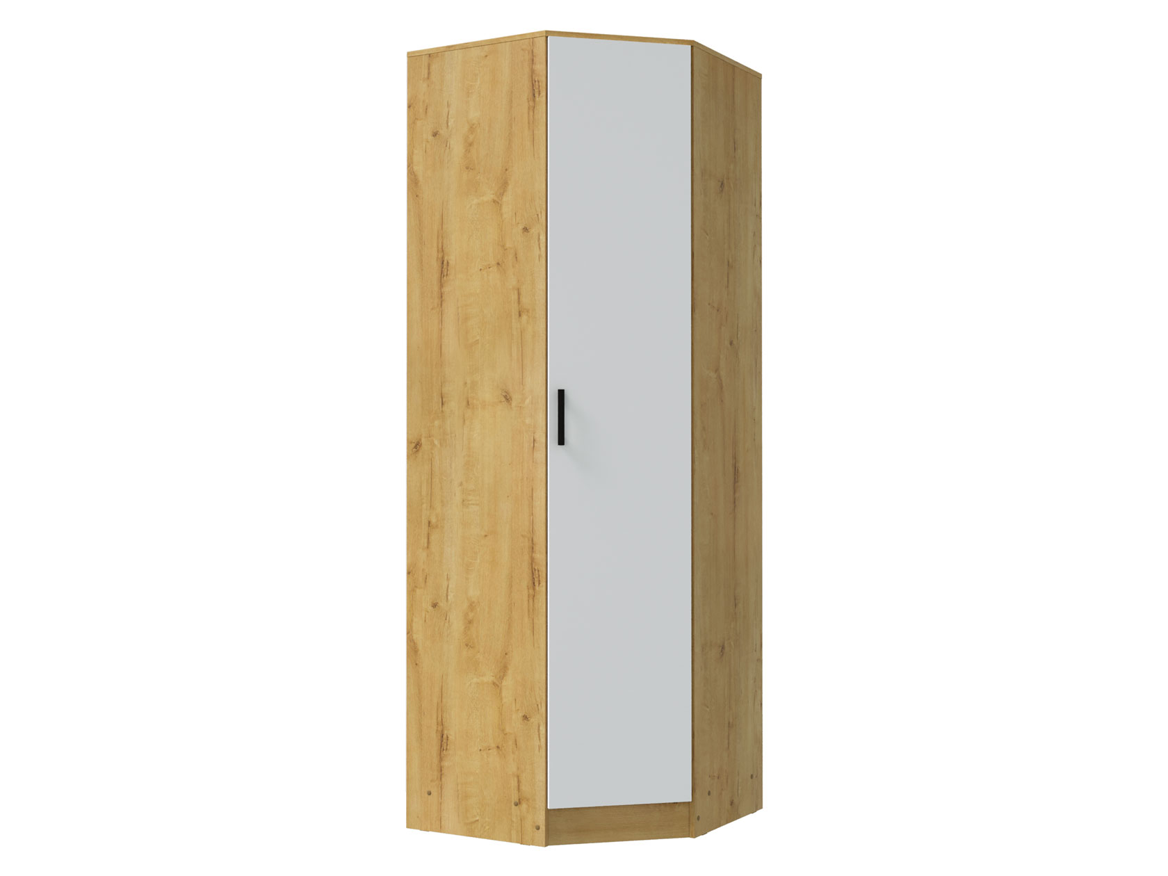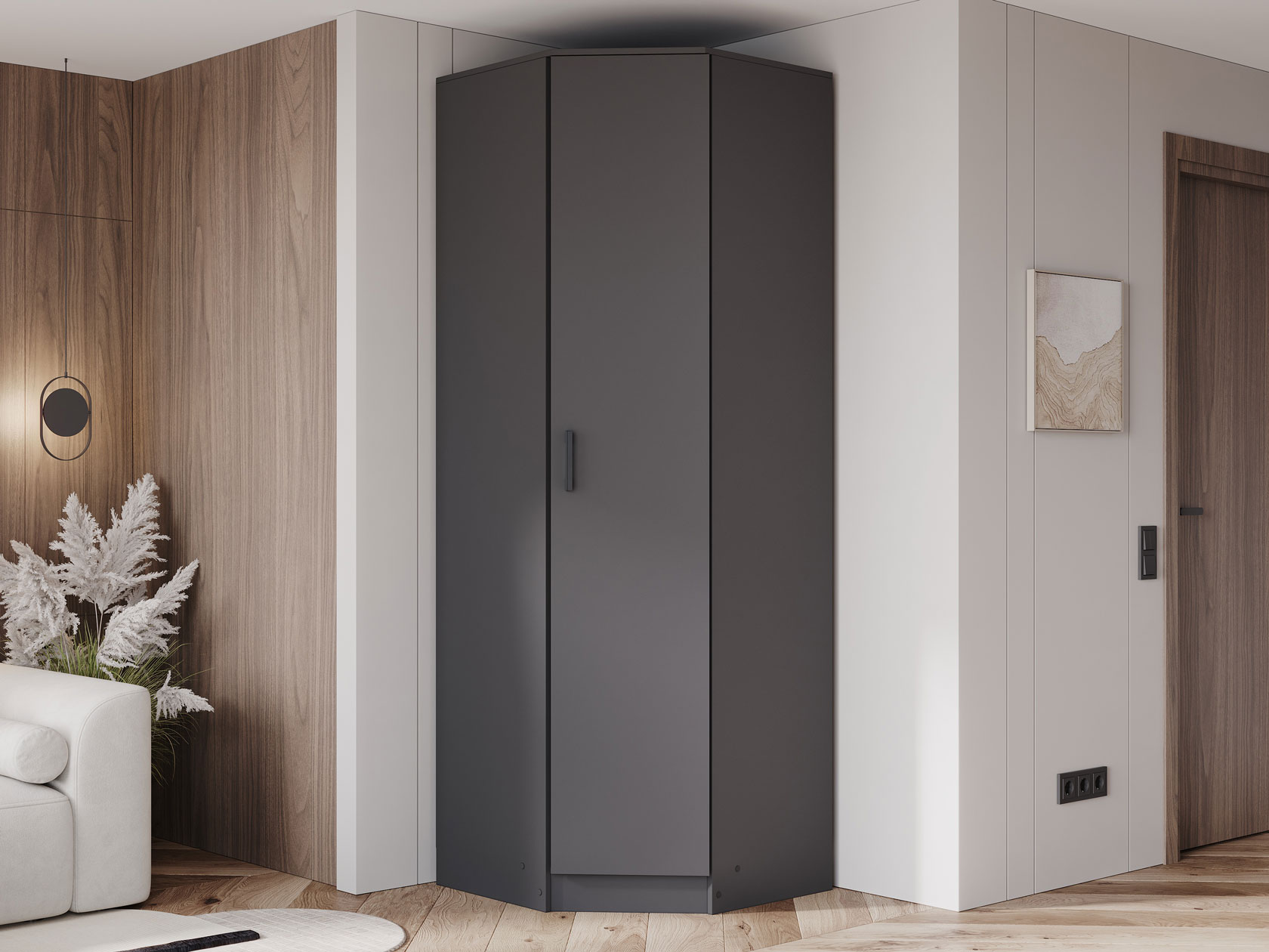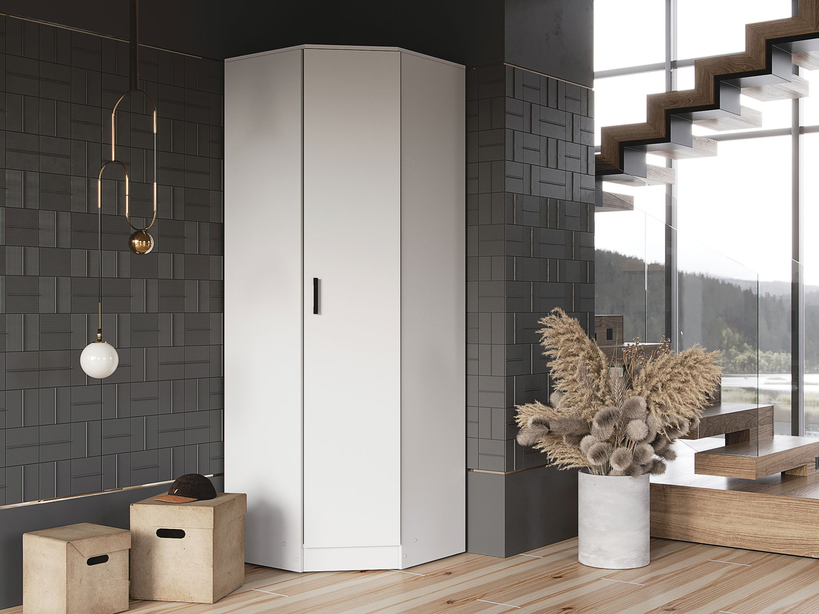 Внутри предусмотрены удобные полки и ниша со штангой для плечиков, где легко разместить предметы гардероба, постельные принадлежности, коробки и даже чемодан. Гладкий матовый фасад дополнен лаконичной ручкой. Минималистичный дизайн легко адаптировать под большинство современных интерьеров.