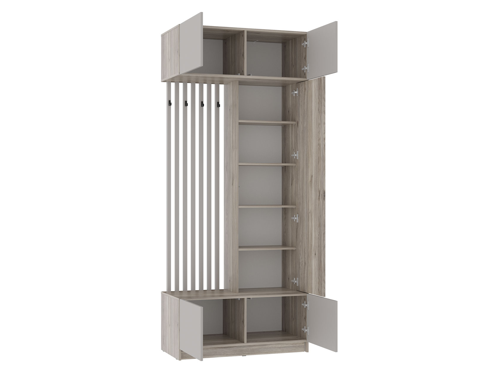 Шкаф с комбинированным внутренним наполнением обеспечит место для верхней одежды, обуви и аксессуаров. Открытая секция с крючками и зеркало добавляют комнате визуального простора. Матовые фасады без внешней фурнитуры лаконично смотрятся в современном интерьере и не вызывают сложностей в уходе.