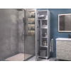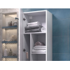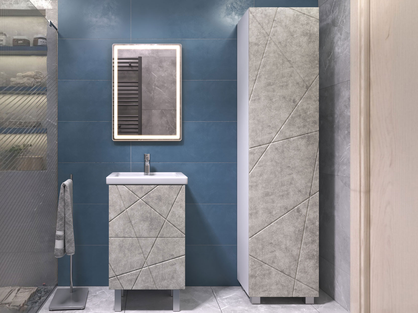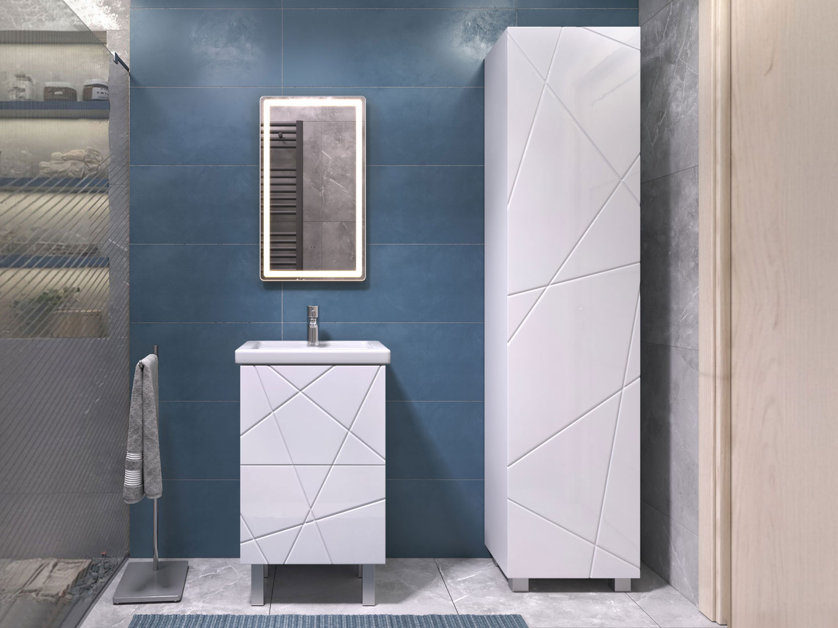 Фасад с трендовым узором придает мебели эффектный вид, а влагостойкие материалы обеспечивают долговечность. Внутри предусмотрены полки для хранения полотенец, бытовой химии или косметики. Регулируемые опоры дарят конструкции устойчивость и облегчают уборку.