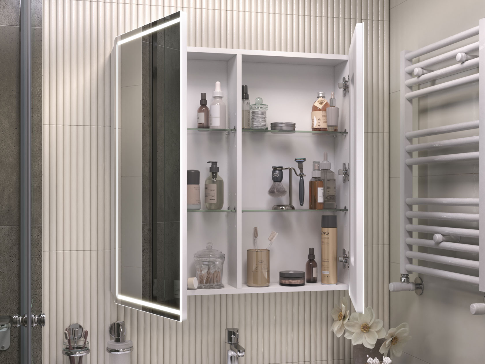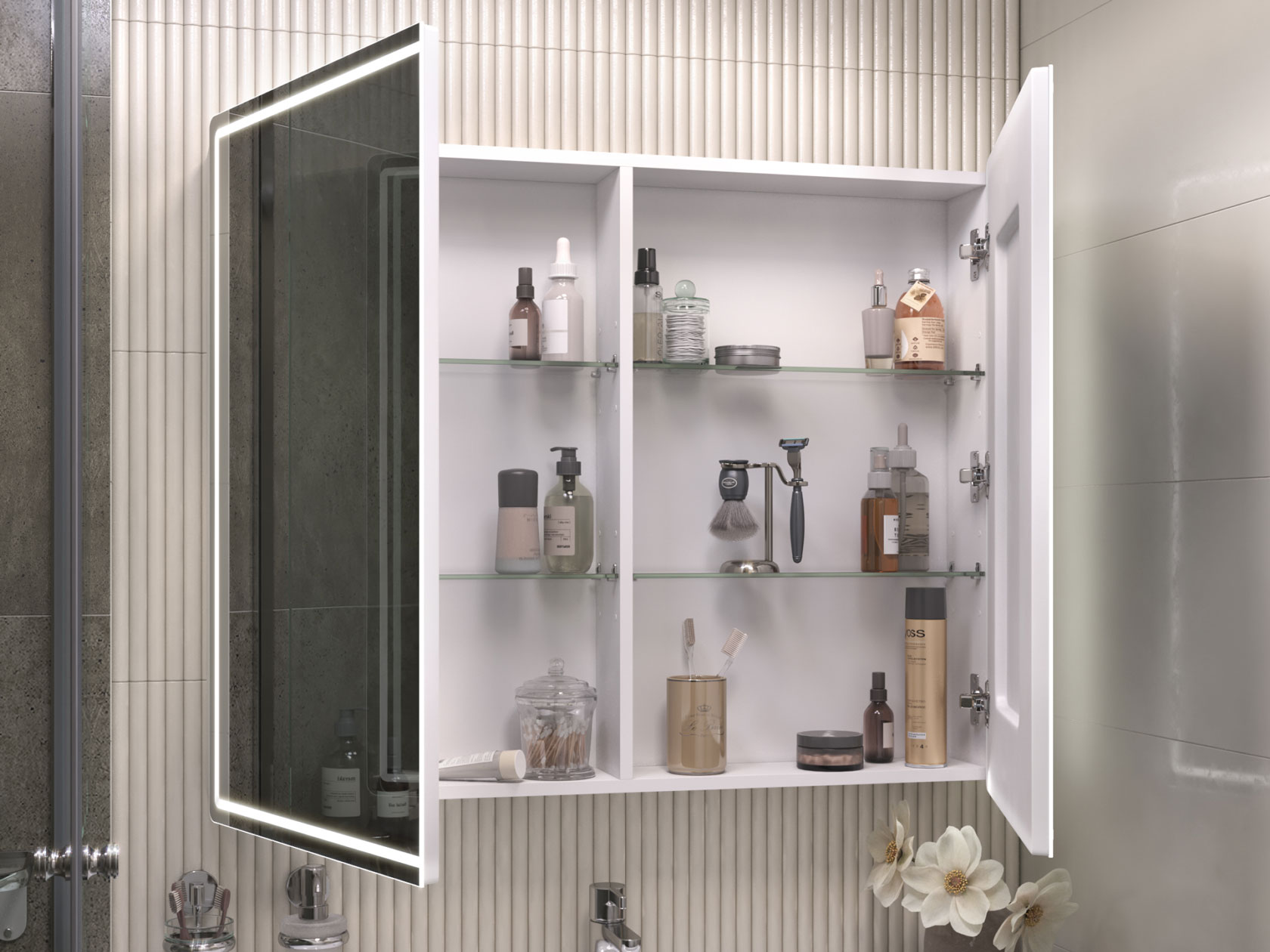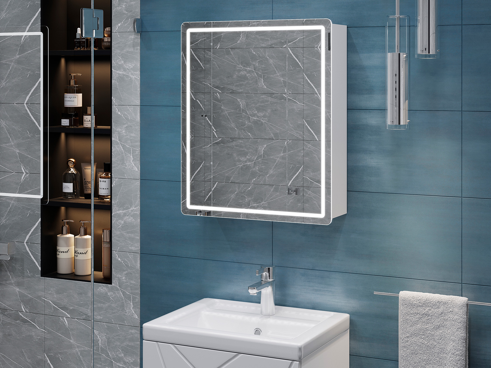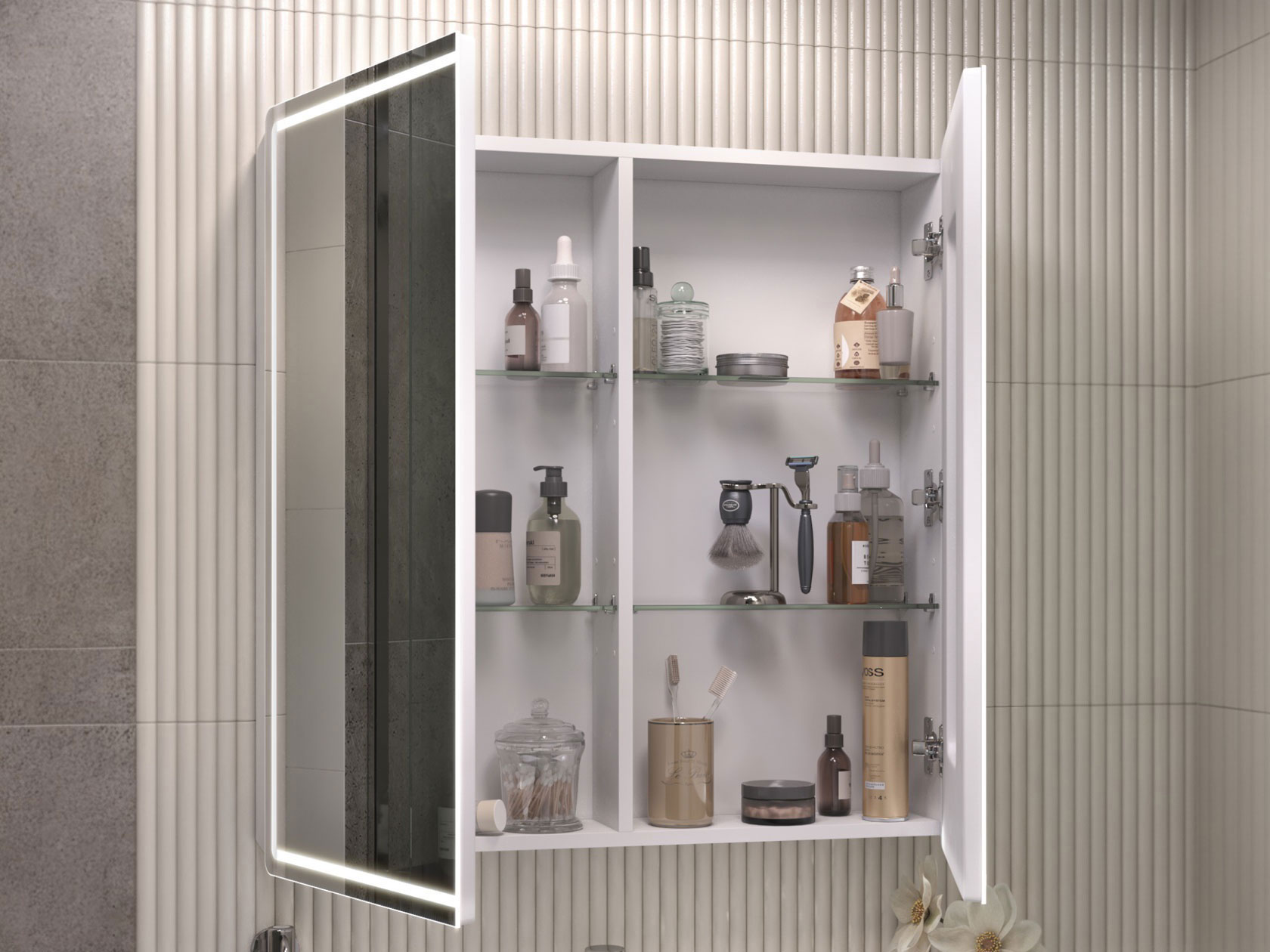 Зеркальная дверца и встроенная LED-подсветка добавляют удобства эксплуатации. Внутри расположены полки, которые подходят для хранения косметики, средств гигиены и других необходимых мелочей. Влагостойкие материалы обеспечивают долговечность.
