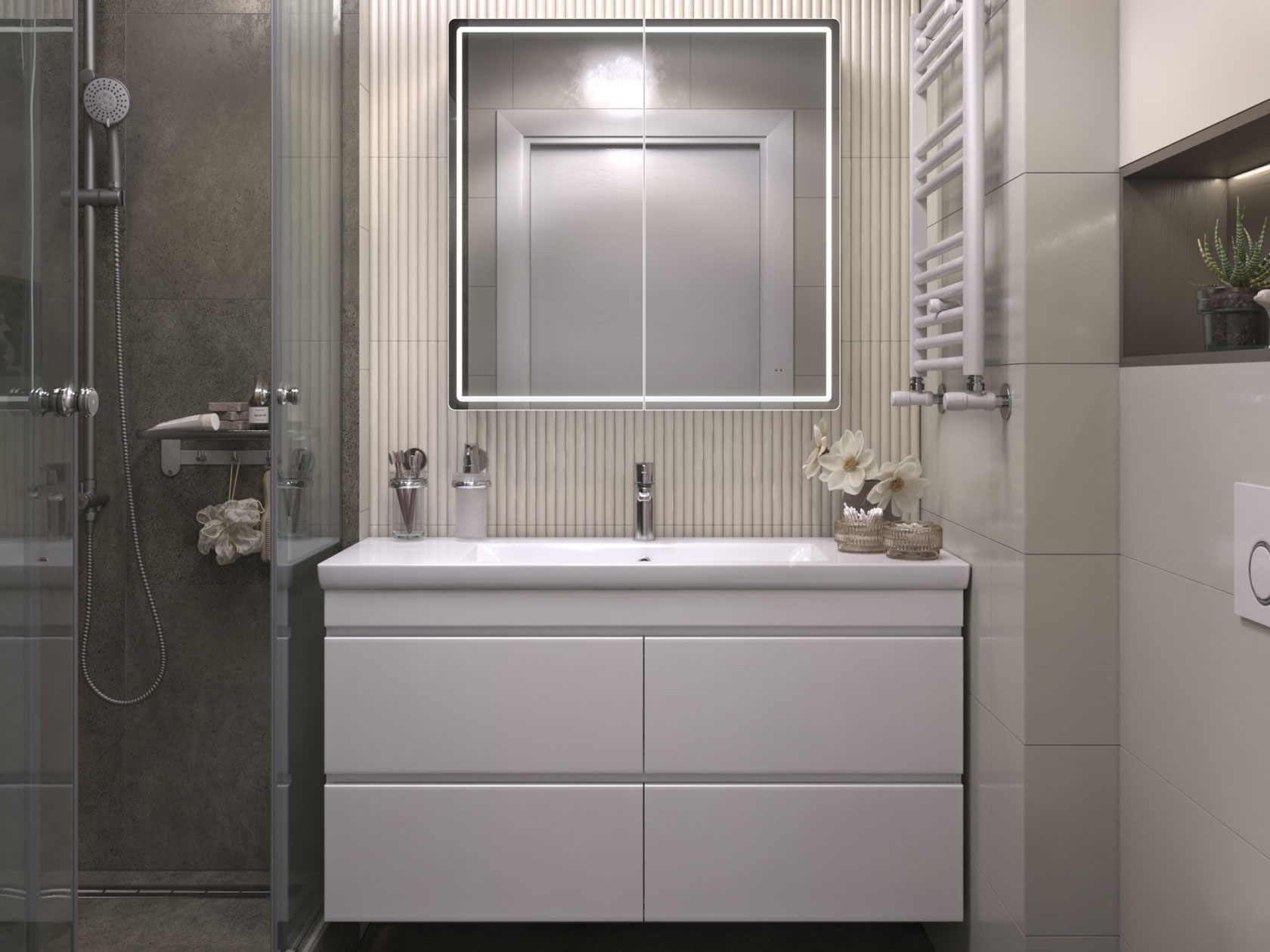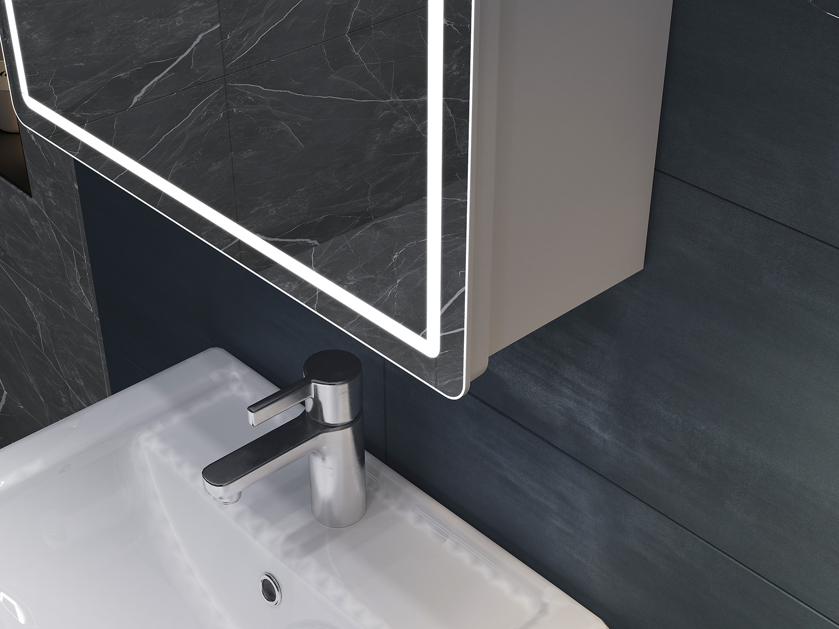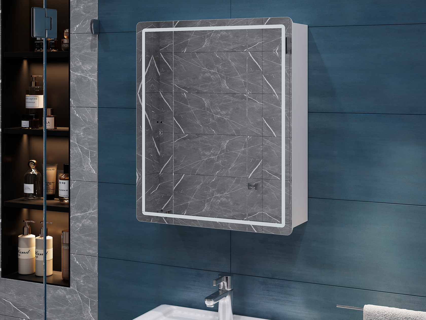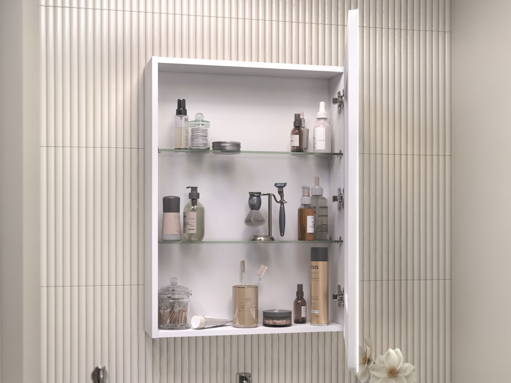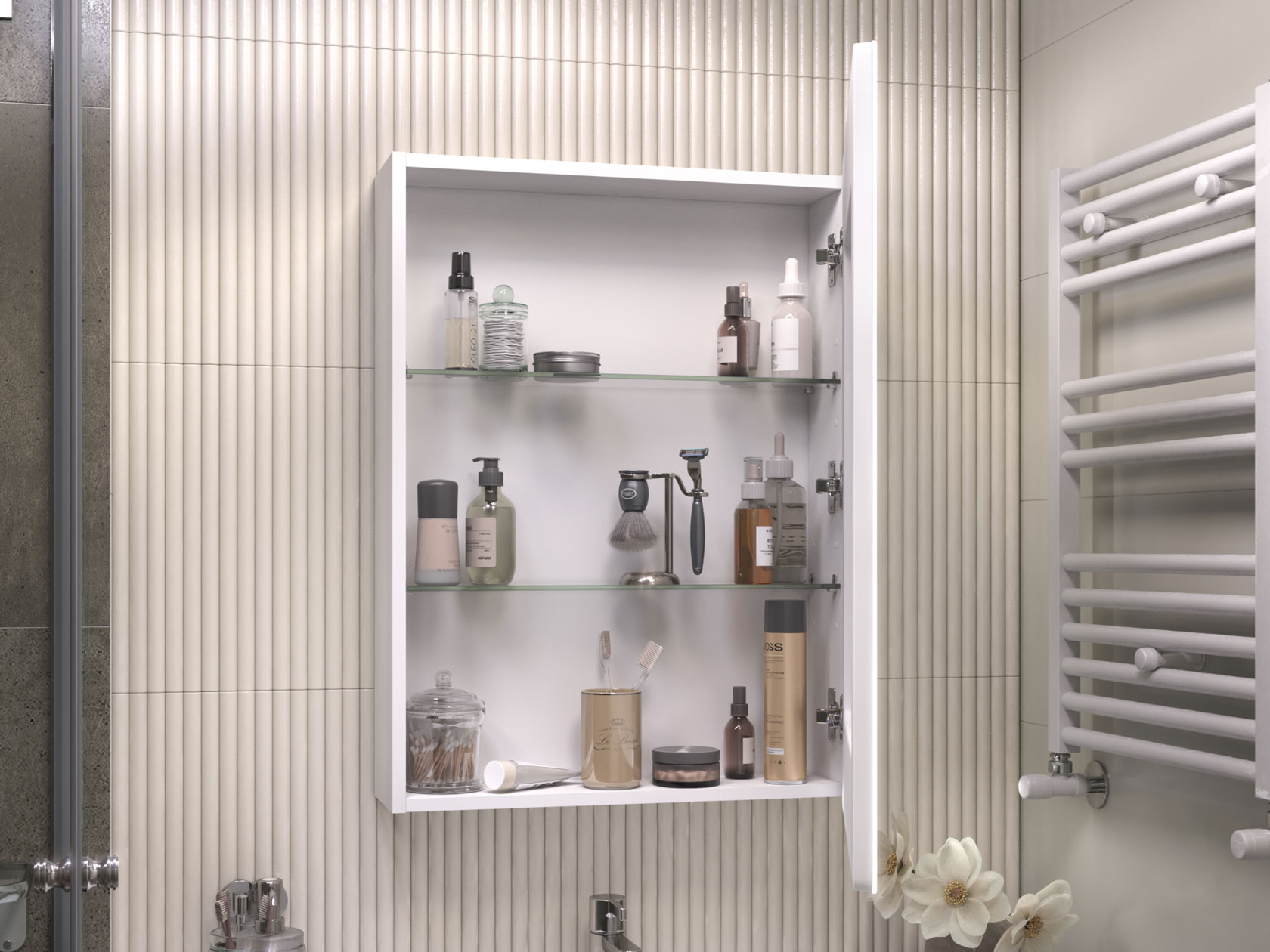 Зеркальная дверца и встроенная LED-подсветка добавляют удобства эксплуатации. Внутри расположены полки, которые подходят для хранения косметики, средств гигиены и других необходимых мелочей. Влагостойкие материалы обеспечивают долговечность.