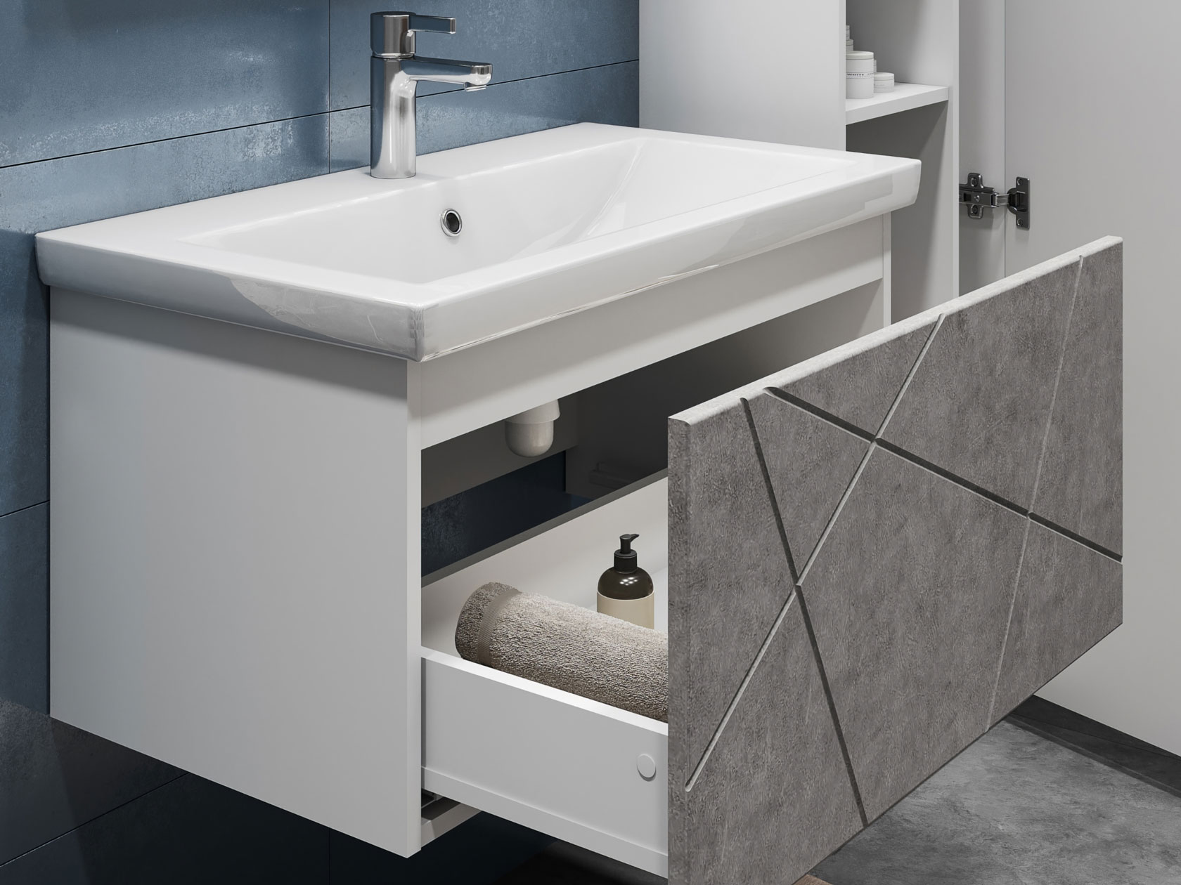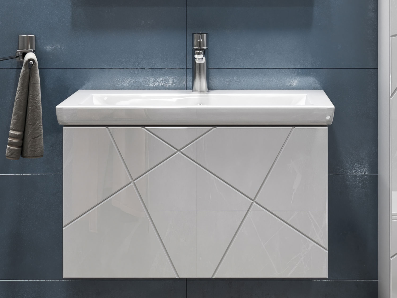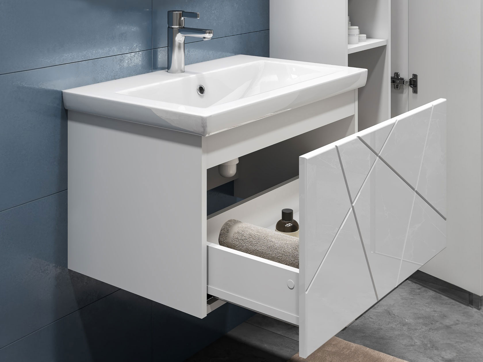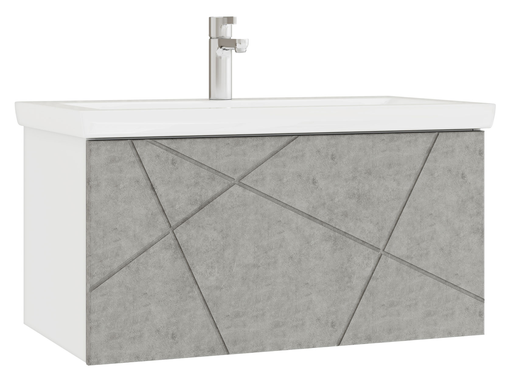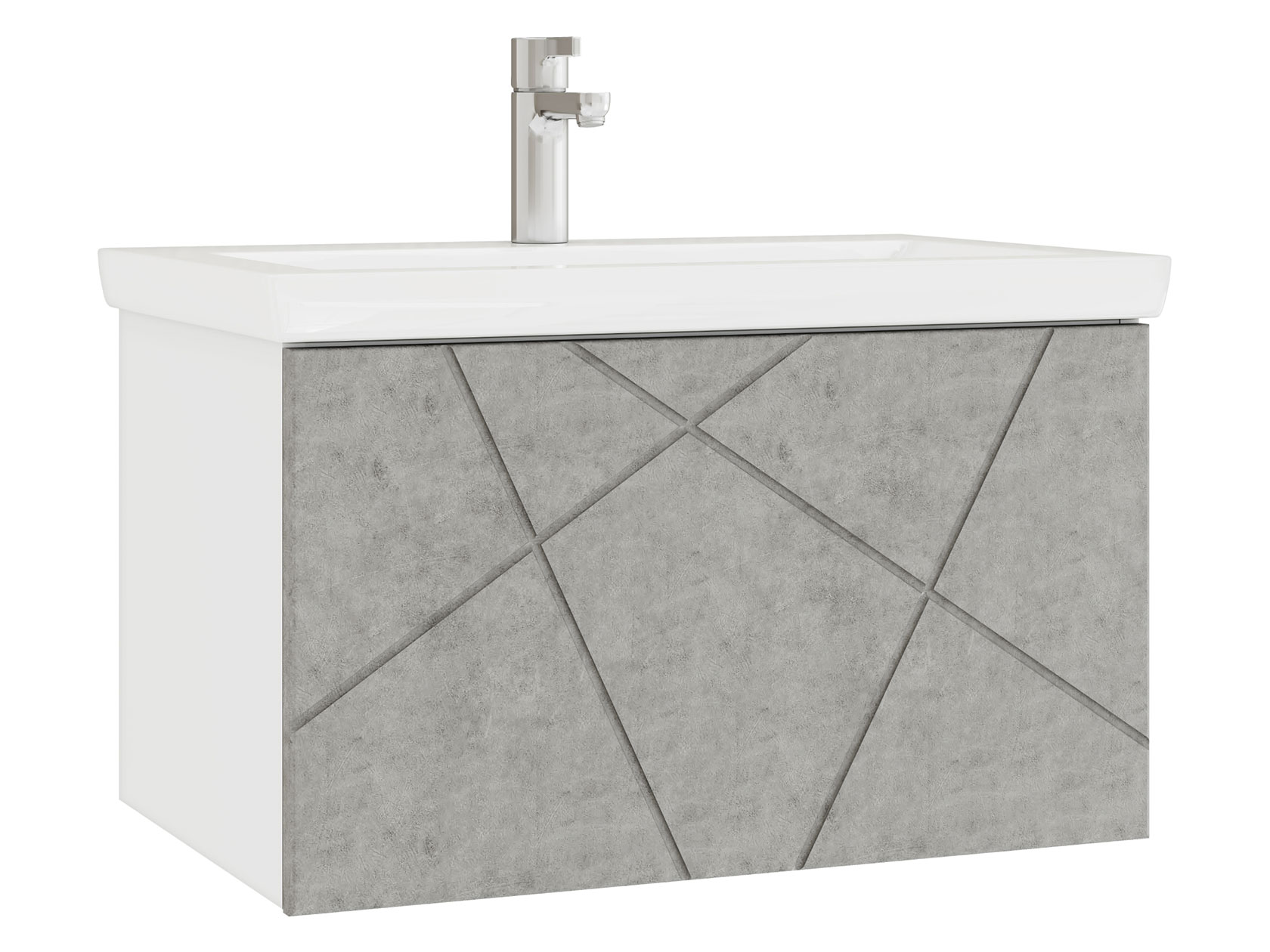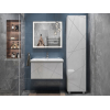 Компактная подвесная тумба оснащена вместительным выдвижным ящиком для хранения бытовых мелочей и косметики. Качественные материалы и фурнитура обеспечивают комфортную эксплуатацию. Матовые фасады с геометрическими линиями добавляют интерьеру динамики.