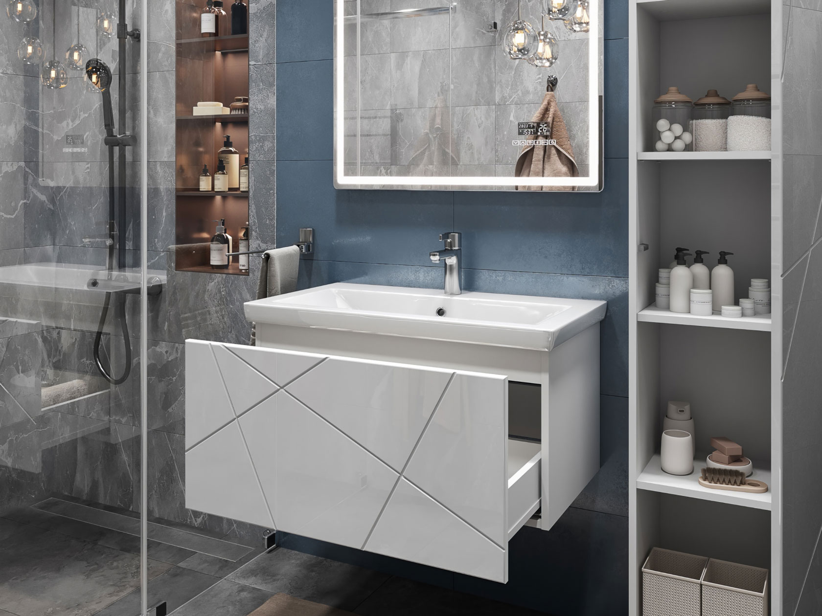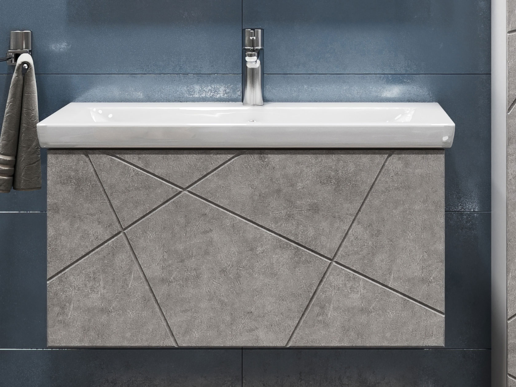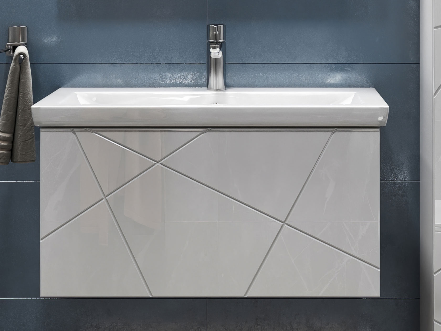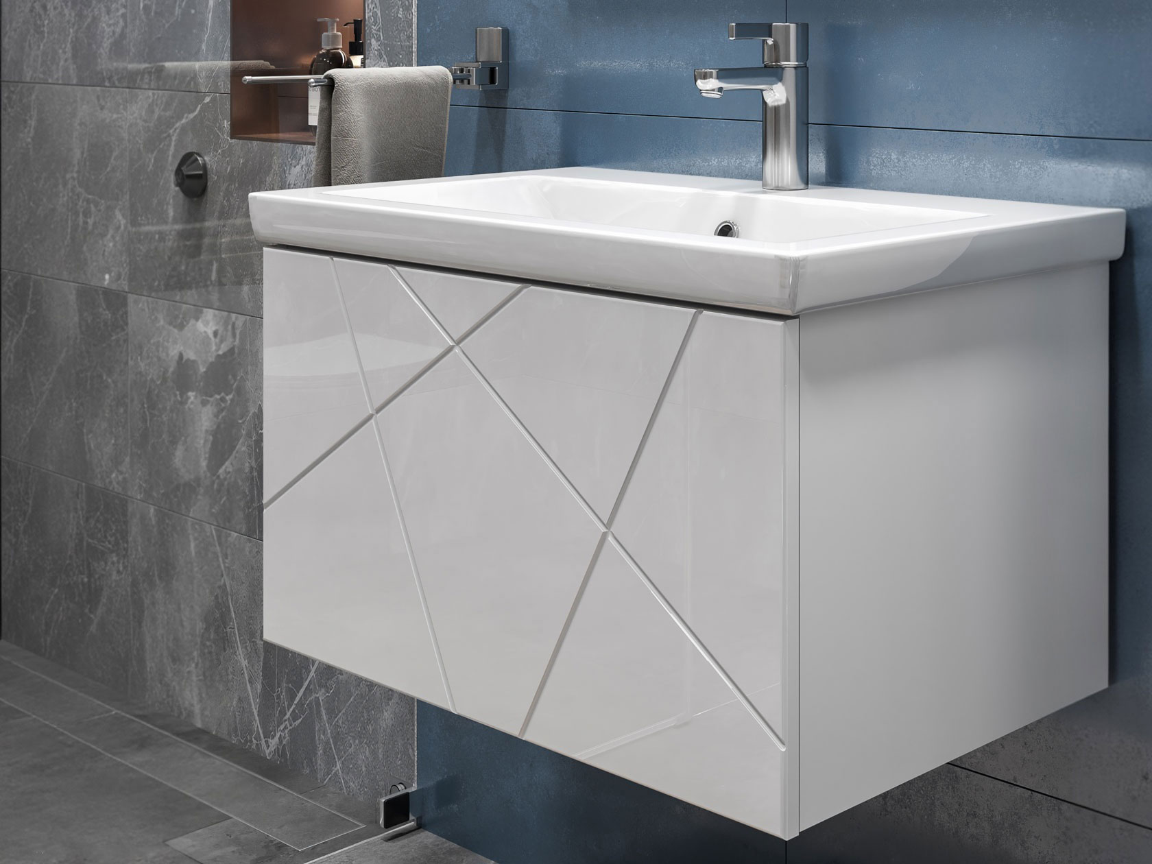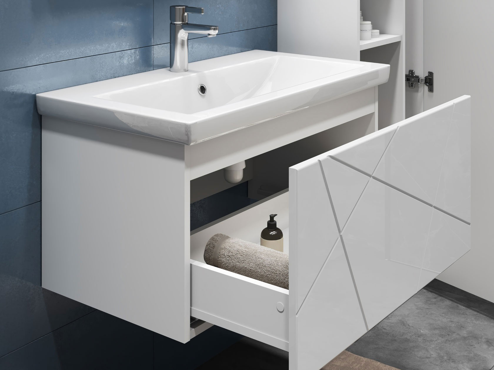 Компактная подвесная тумба оснащена вместительным выдвижным ящиком для хранения бытовых мелочей и косметики. Качественные материалы и фурнитура обеспечивают комфортную эксплуатацию. Матовые фасады с геометрическими линиями добавляют интерьеру динамики.