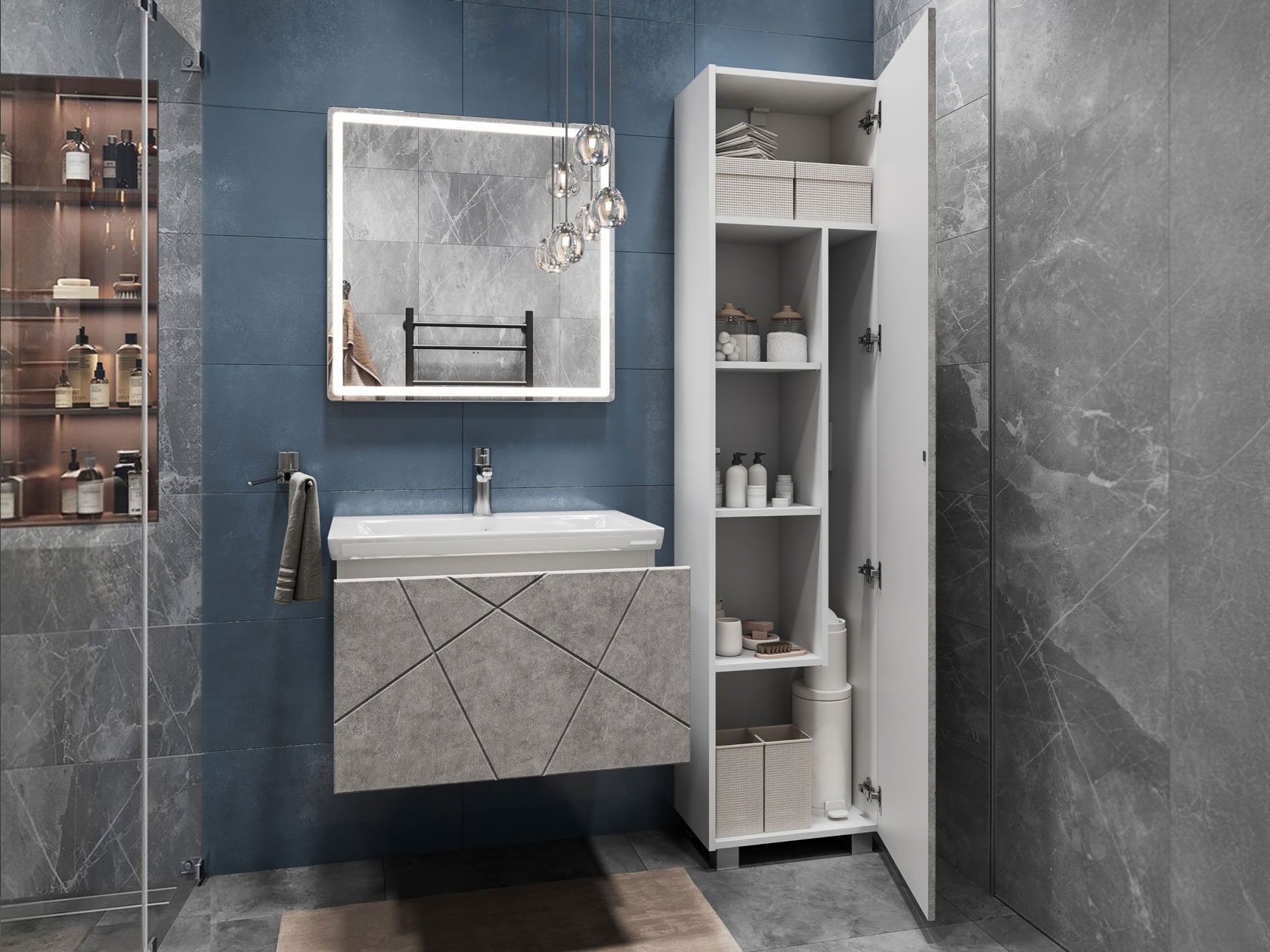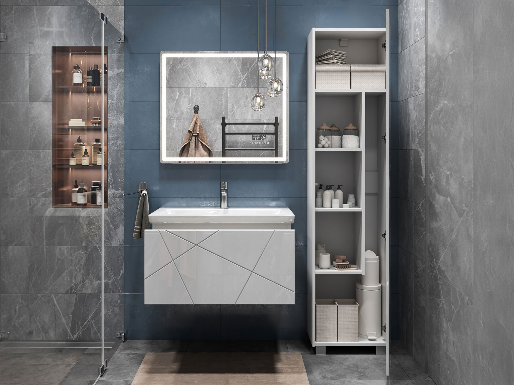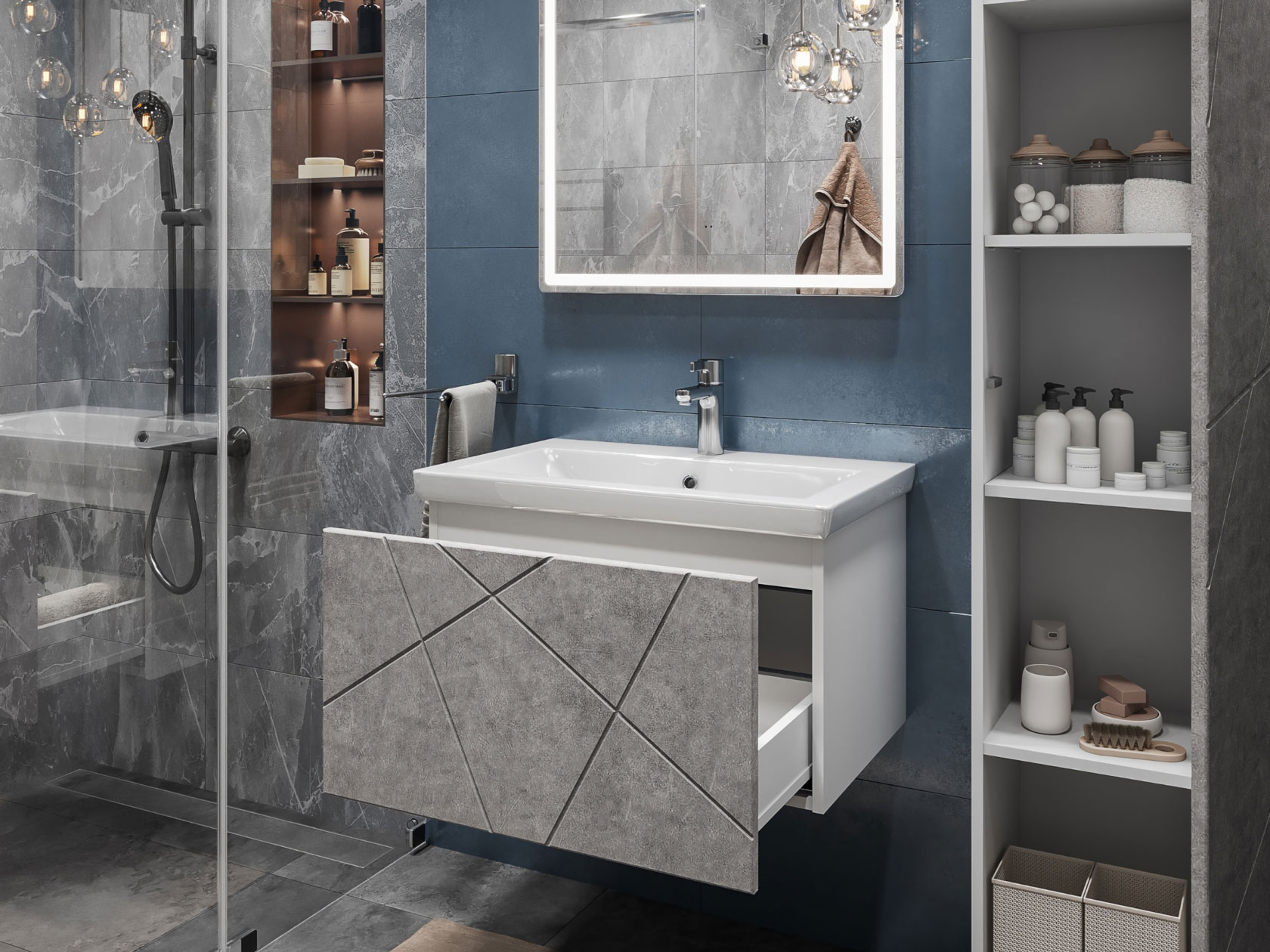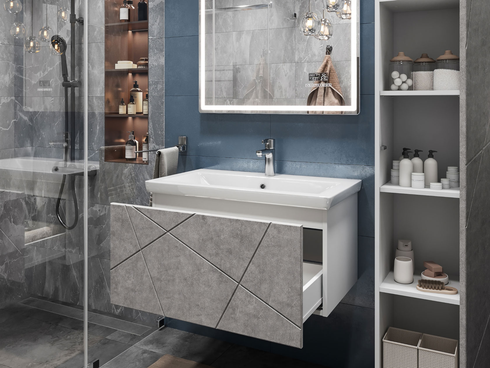 Компактная подвесная тумба оснащена вместительным выдвижным ящиком для хранения бытовых мелочей и косметики. Качественные материалы и фурнитура обеспечивают комфортную эксплуатацию. Матовые фасады с геометрическими линиями добавляют интерьеру динамики.