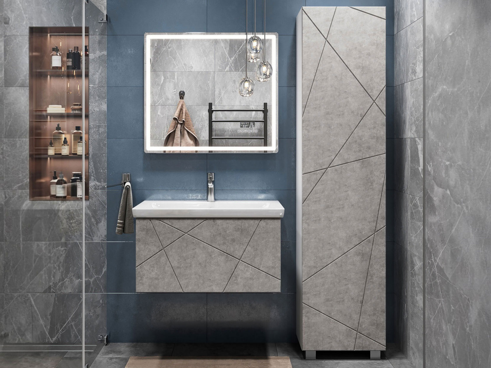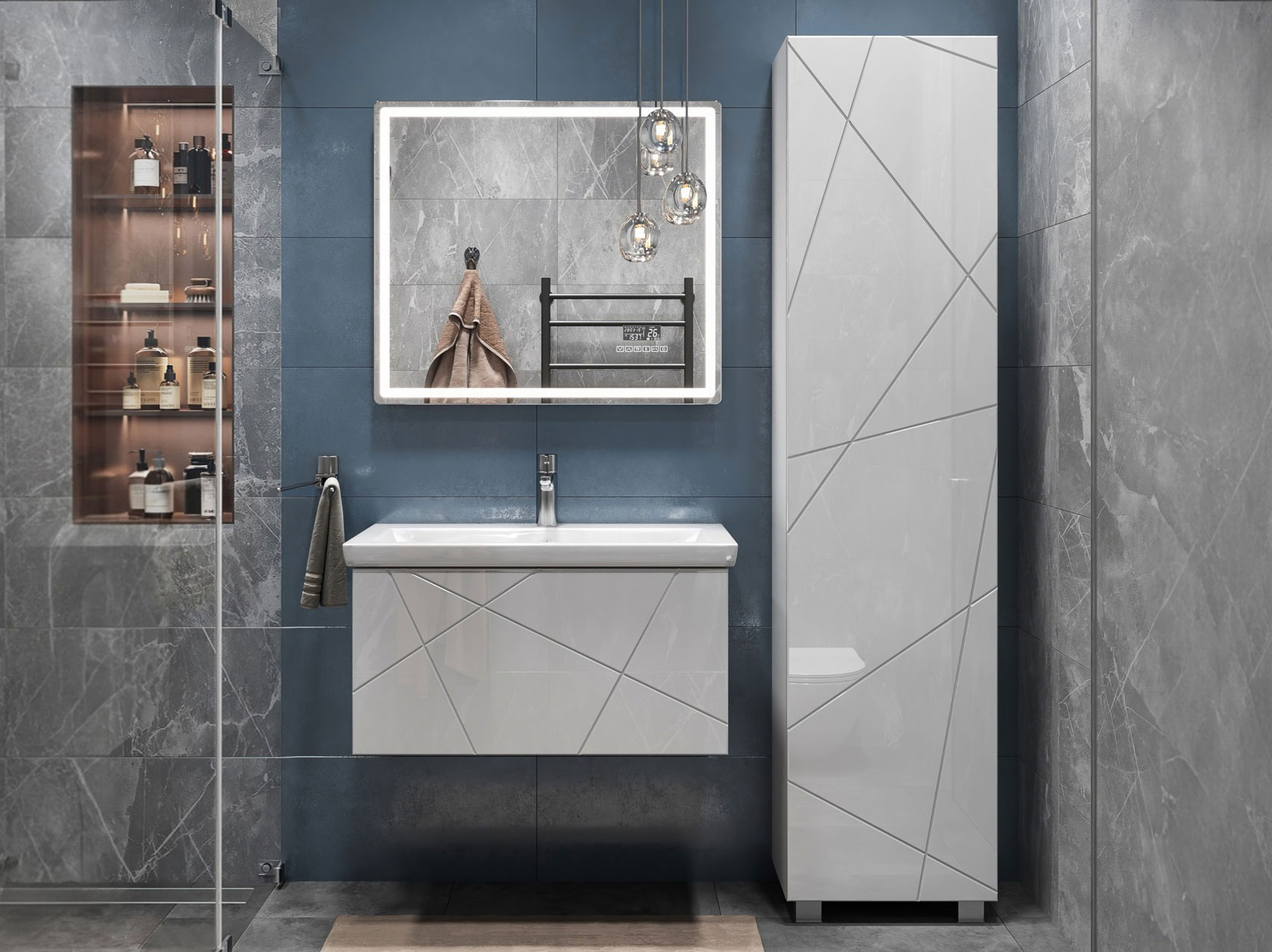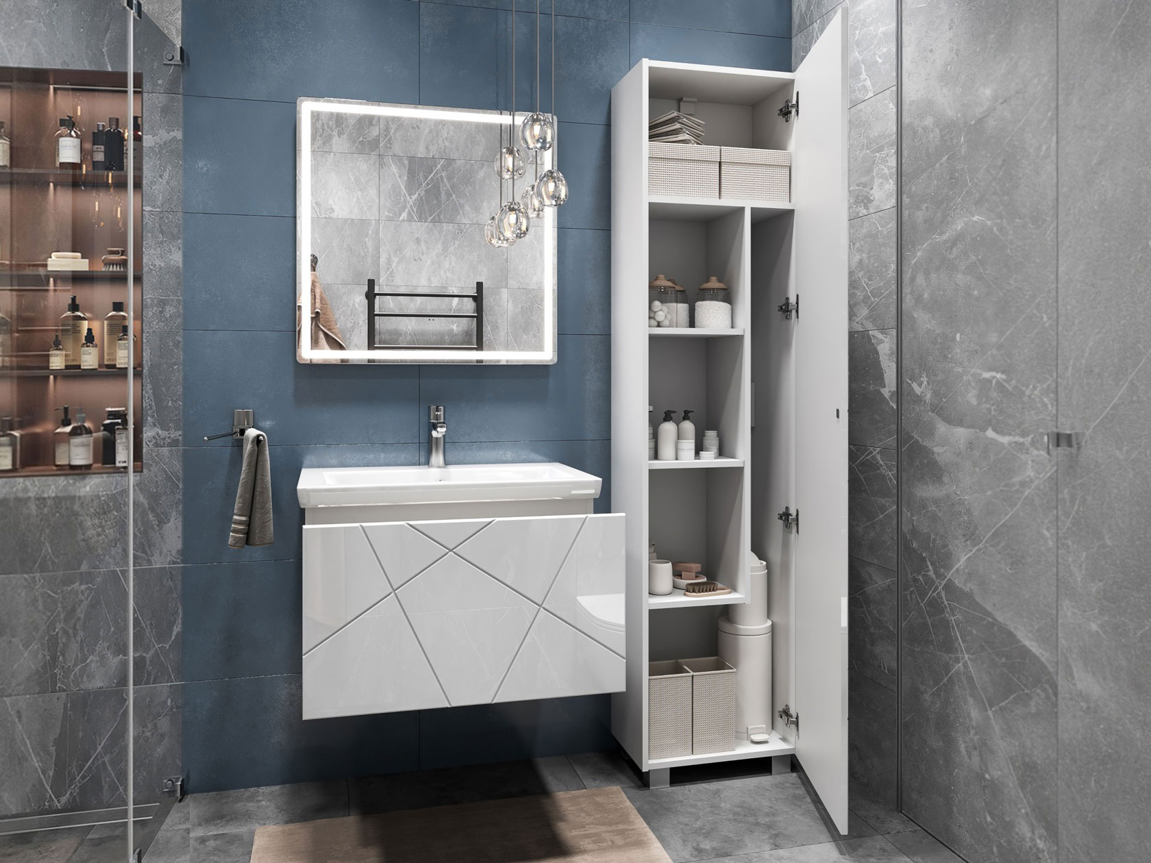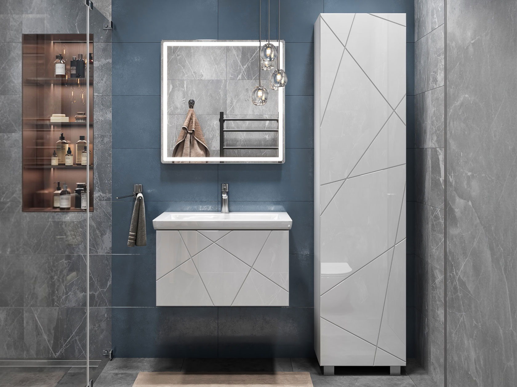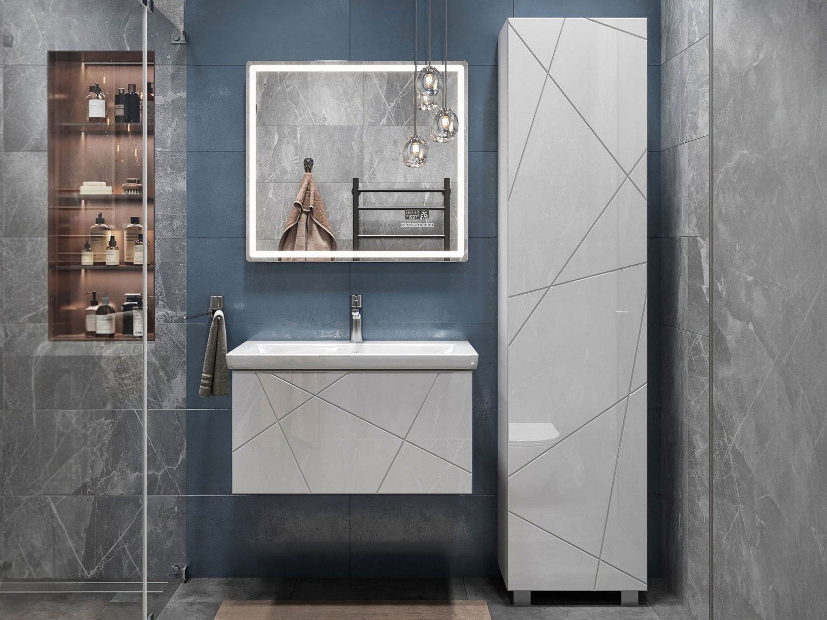 Компактная подвесная тумба оснащена вместительным выдвижным ящиком для хранения бытовых мелочей и косметики. Качественные материалы и фурнитура обеспечивают комфортную эксплуатацию. Матовые фасады с геометрическими линиями добавляют интерьеру динамики.