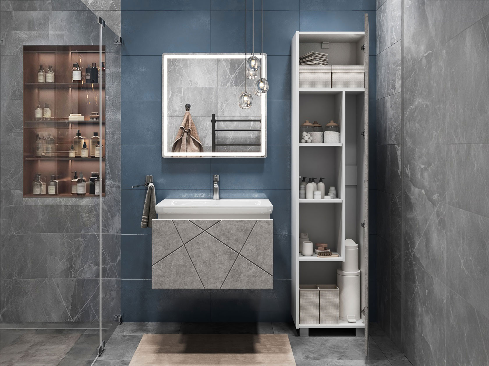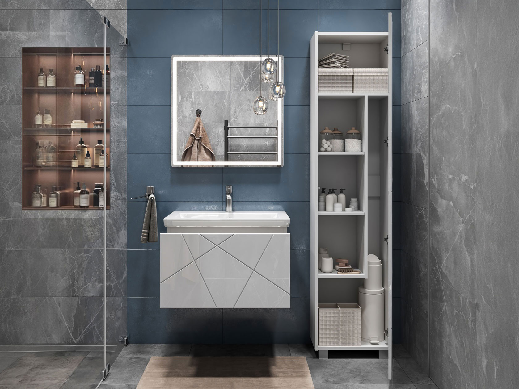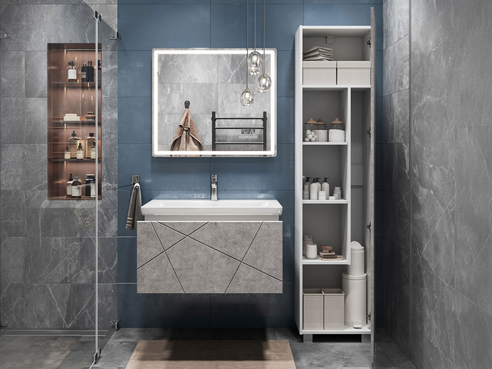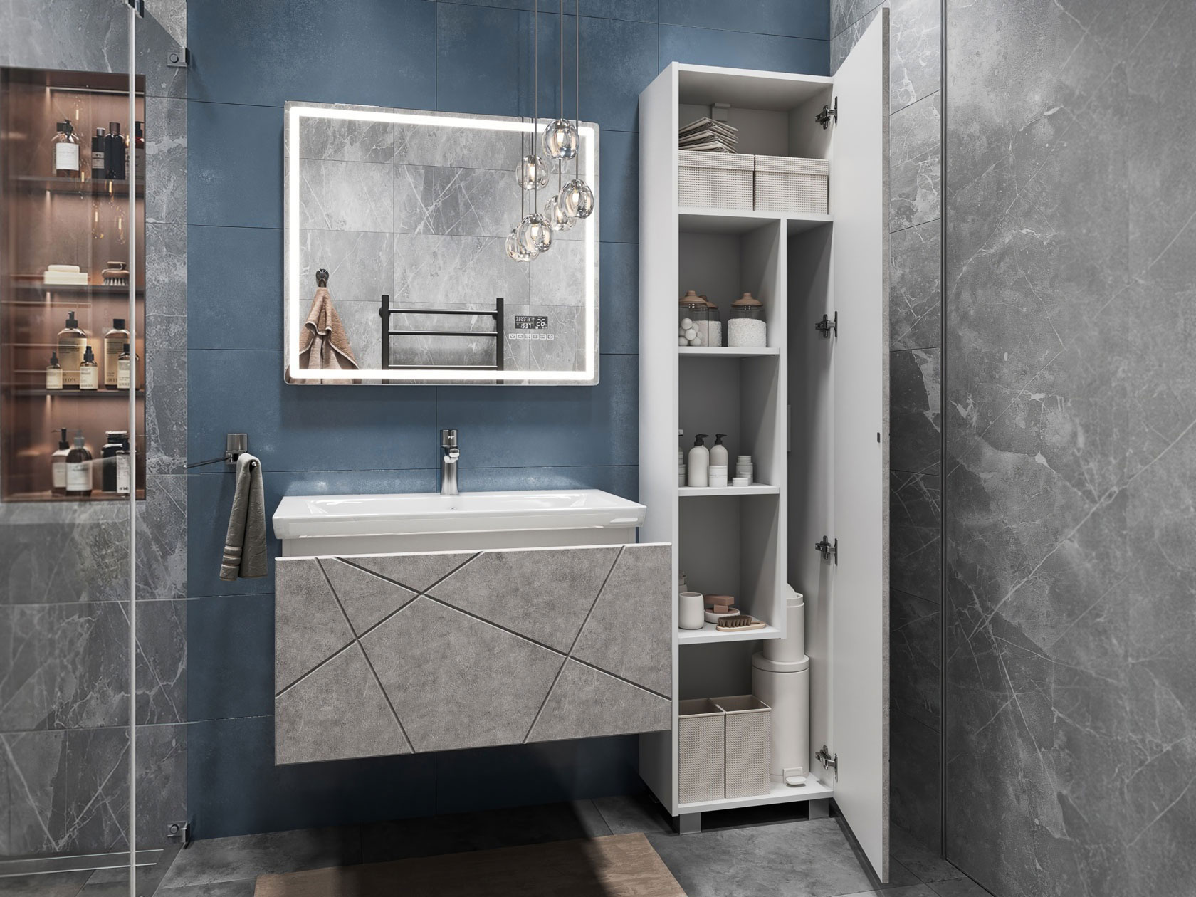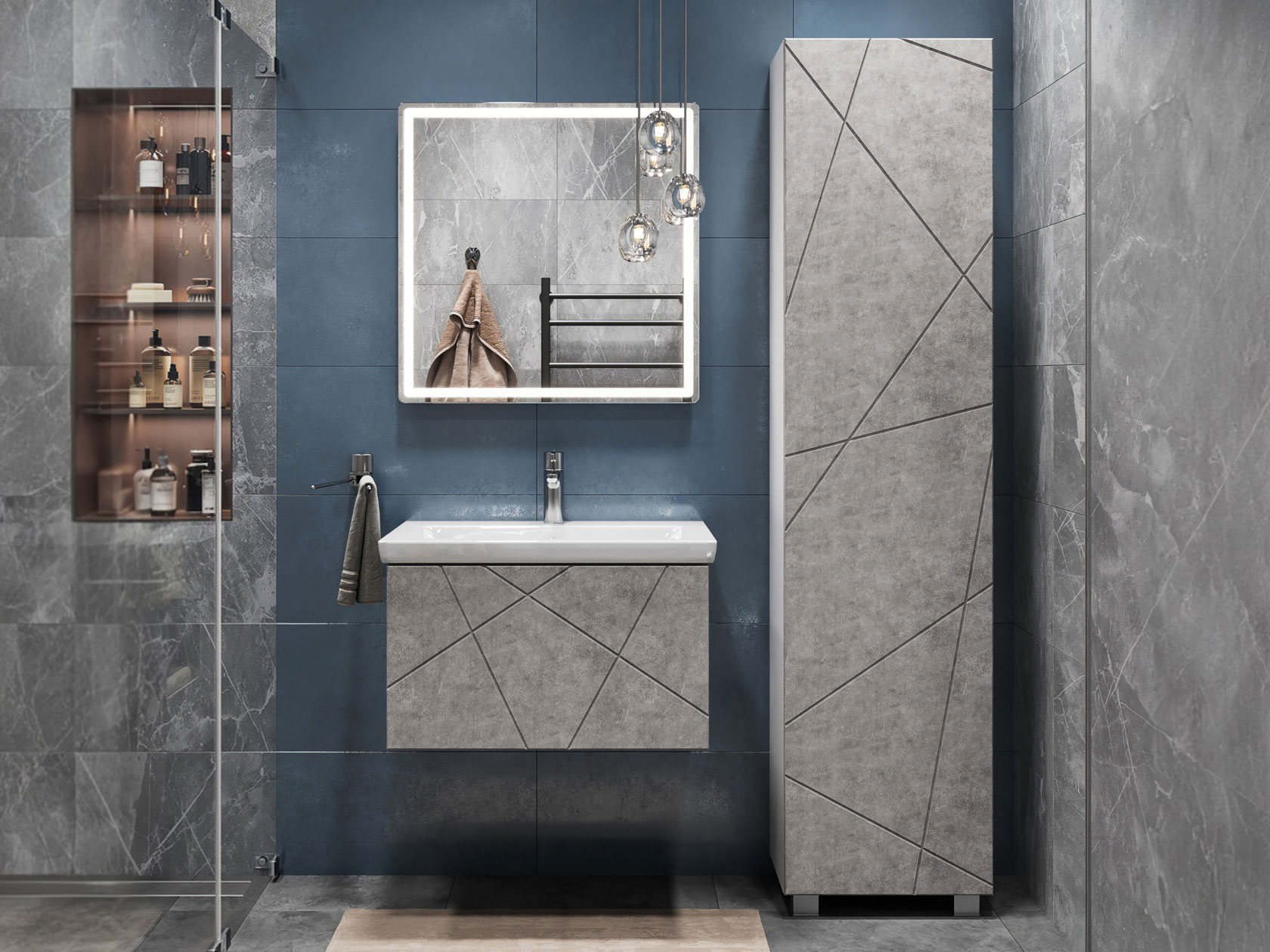 Компактная подвесная тумба оснащена вместительным выдвижным ящиком для хранения бытовых мелочей и косметики. Качественные материалы и фурнитура обеспечивают комфортную эксплуатацию. Матовые фасады с геометрическими линиями добавляют интерьеру динамики.
