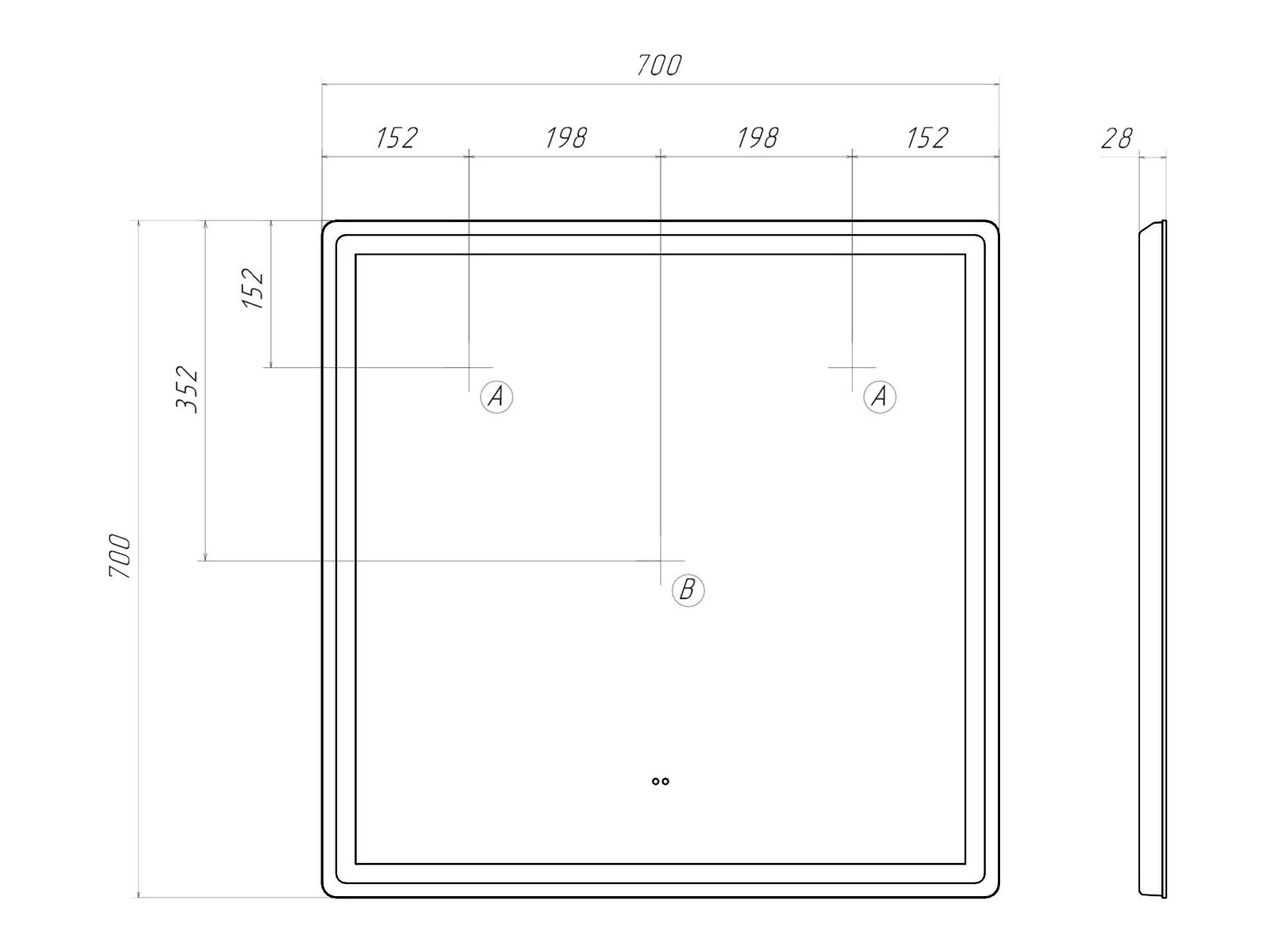 Зеркало LED: 70 х 70 х 2,8 см.