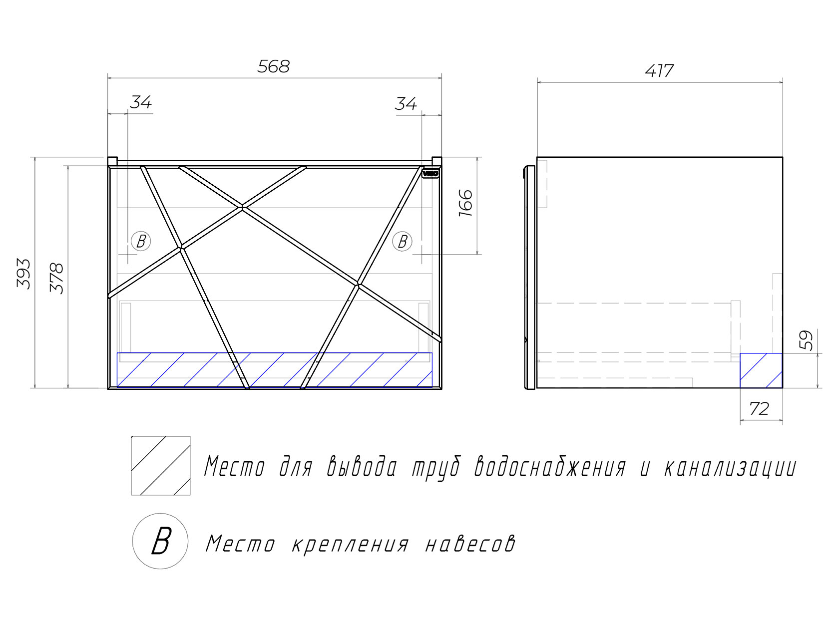 Навесная тумба под раковину: 39,5 х 56,8 х 43,8 см.