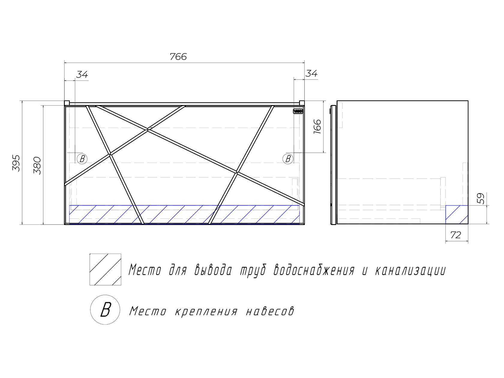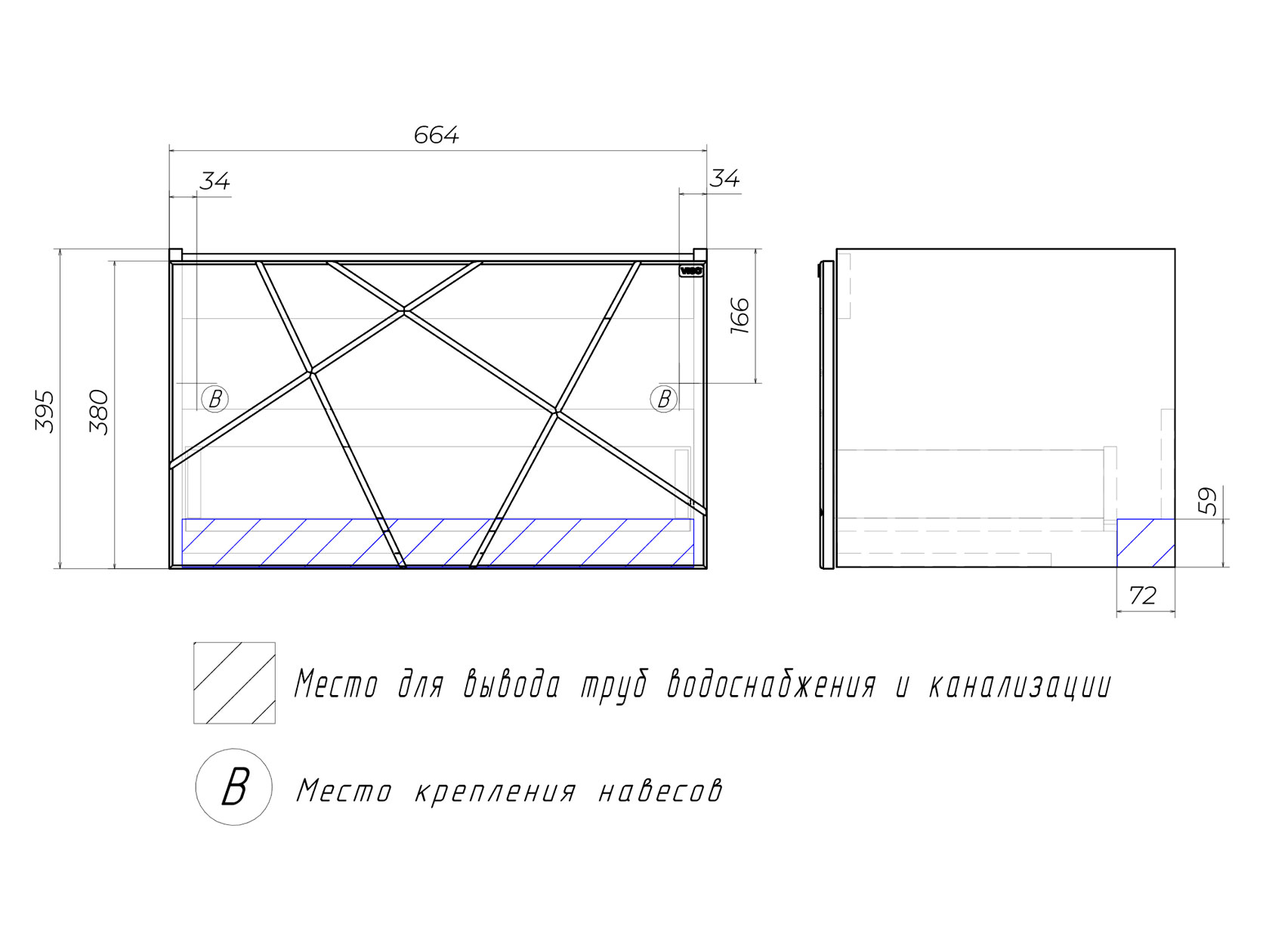 Навесная тумба под раковину: 39,5 х 66,4 х 43,8 см.