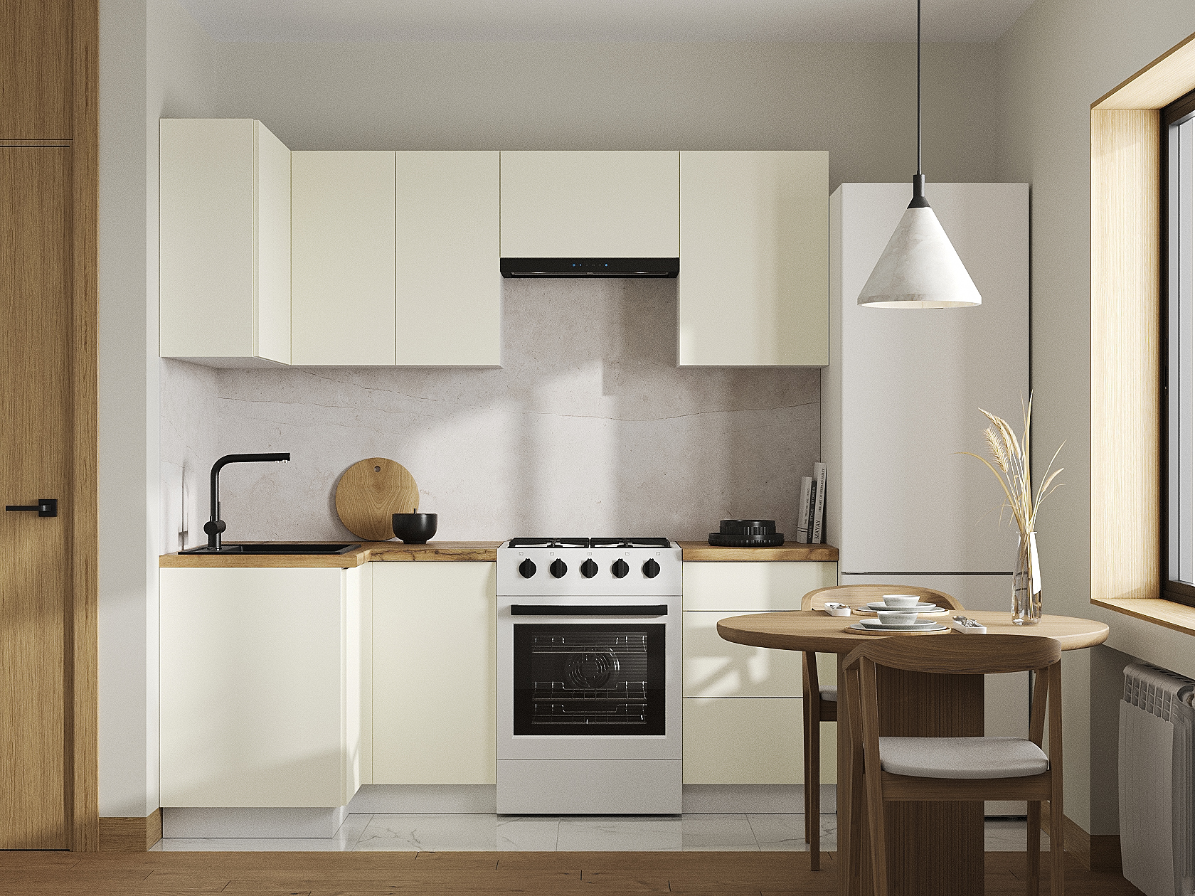 Угловое расположение элементов оптимизирует пространство и создает удобную рабочую зону для ежедневного приготовления блюд. Выдвижные ящики оснащены направляющими с плавным ходом и обеспечивают быстрый доступ к необходимой утвари.