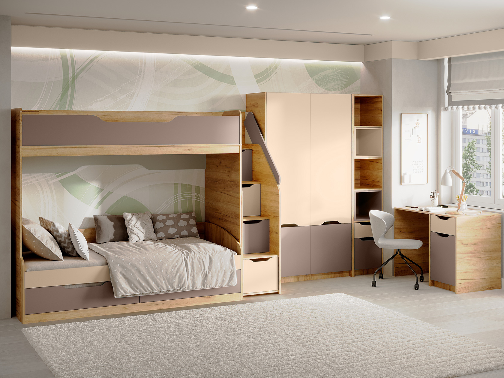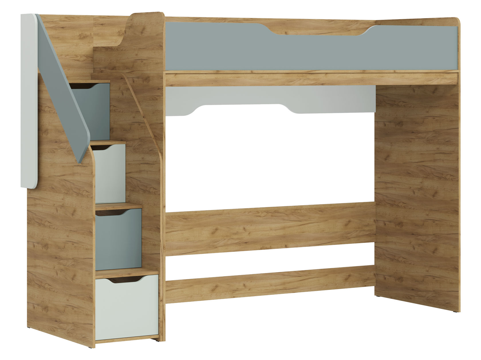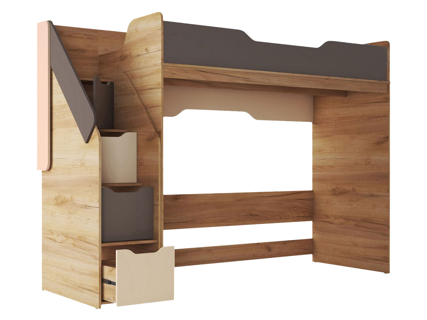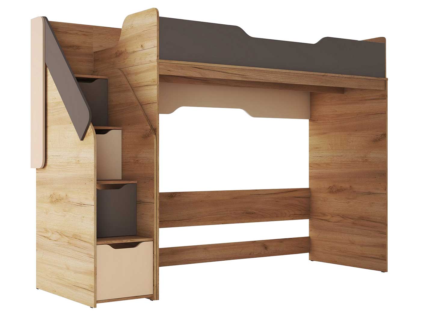 Высокие бортики на втором ярусе кровати гарантируют безопасность ребенка. Ручки-прорези делают эксплуатацию максимально комфортной. Лестница с ящиками позволит распределить различные вещи без лишних затрат пространства.