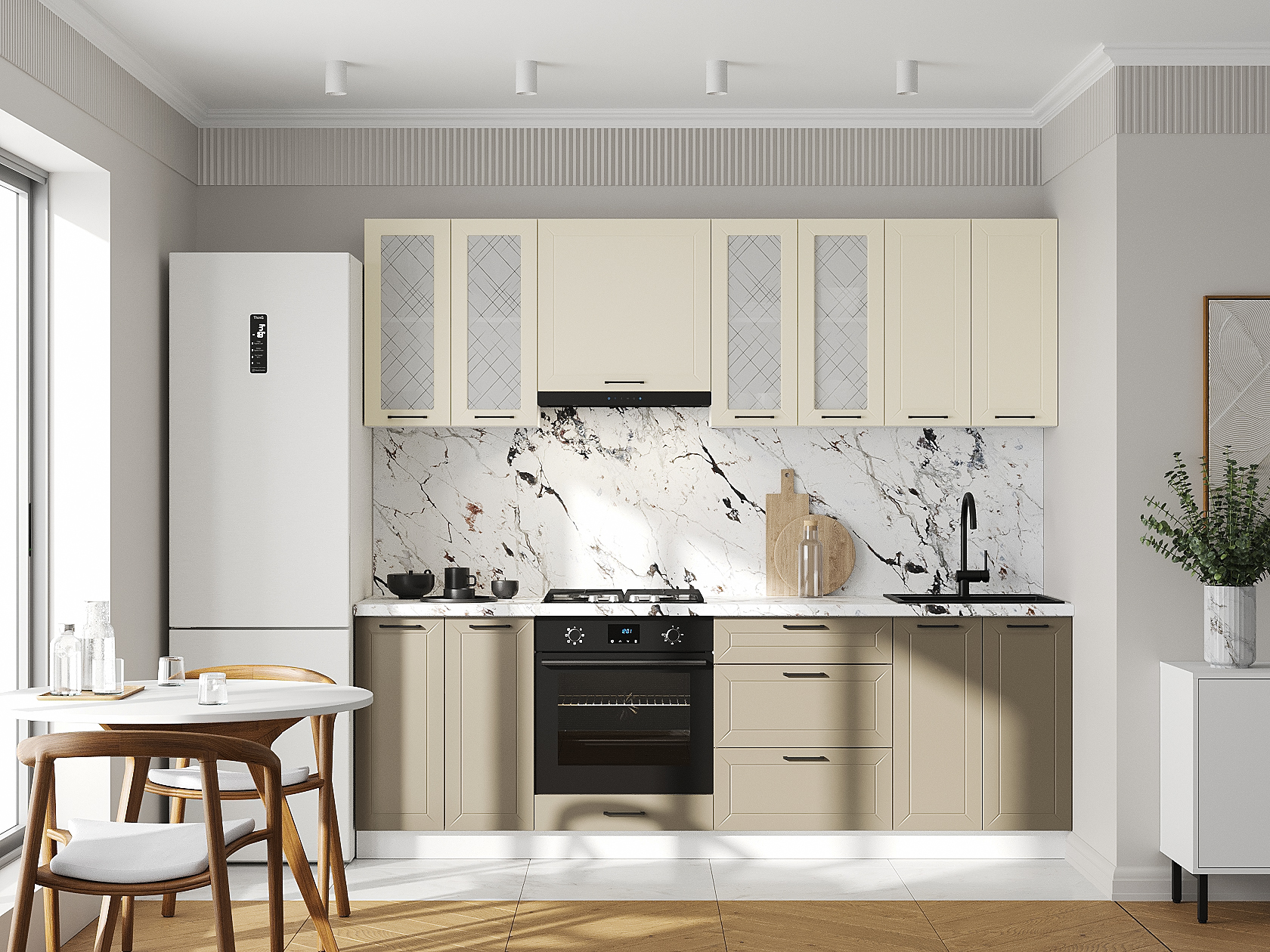 Набор элементов поможет организовать удобное хранение и создаст комфортное пространство для приготовления блюд. Верхний ряд мебели украшен стеклянными дверцами с ромбовидным узором, что добавляет обстановке уютные акценты.