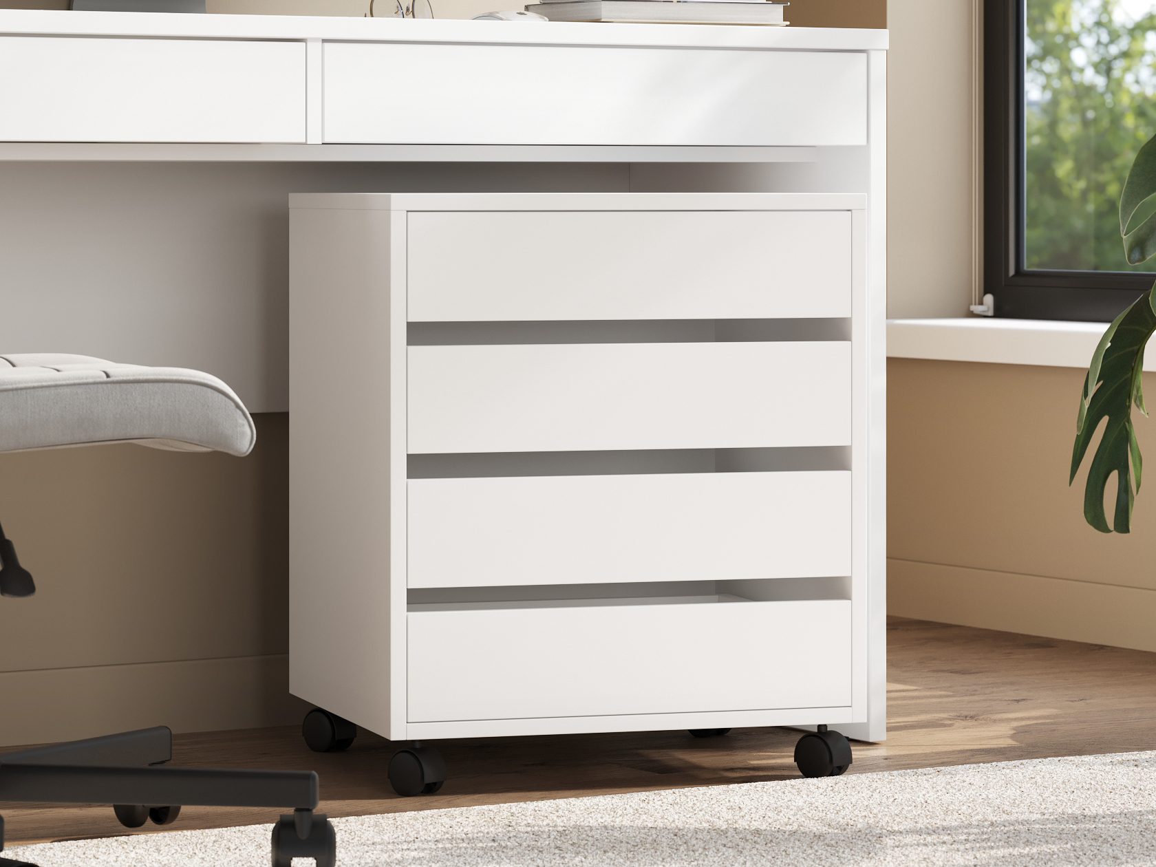В выдвижных ящиках можно хранить необходимые канцелярские принадлежности, документы и различные полезные мелочи. Колесики позволят легко переместить модель.