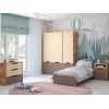 Зона отдыха включает удобную кровать и небольшую тумбочку, а для одежды и игрушек есть вместительная шкафная группа и комод с ящиками. Фасады выполнены в приятных оттенках и дополнены эргономичными прорезями вместо ручек.