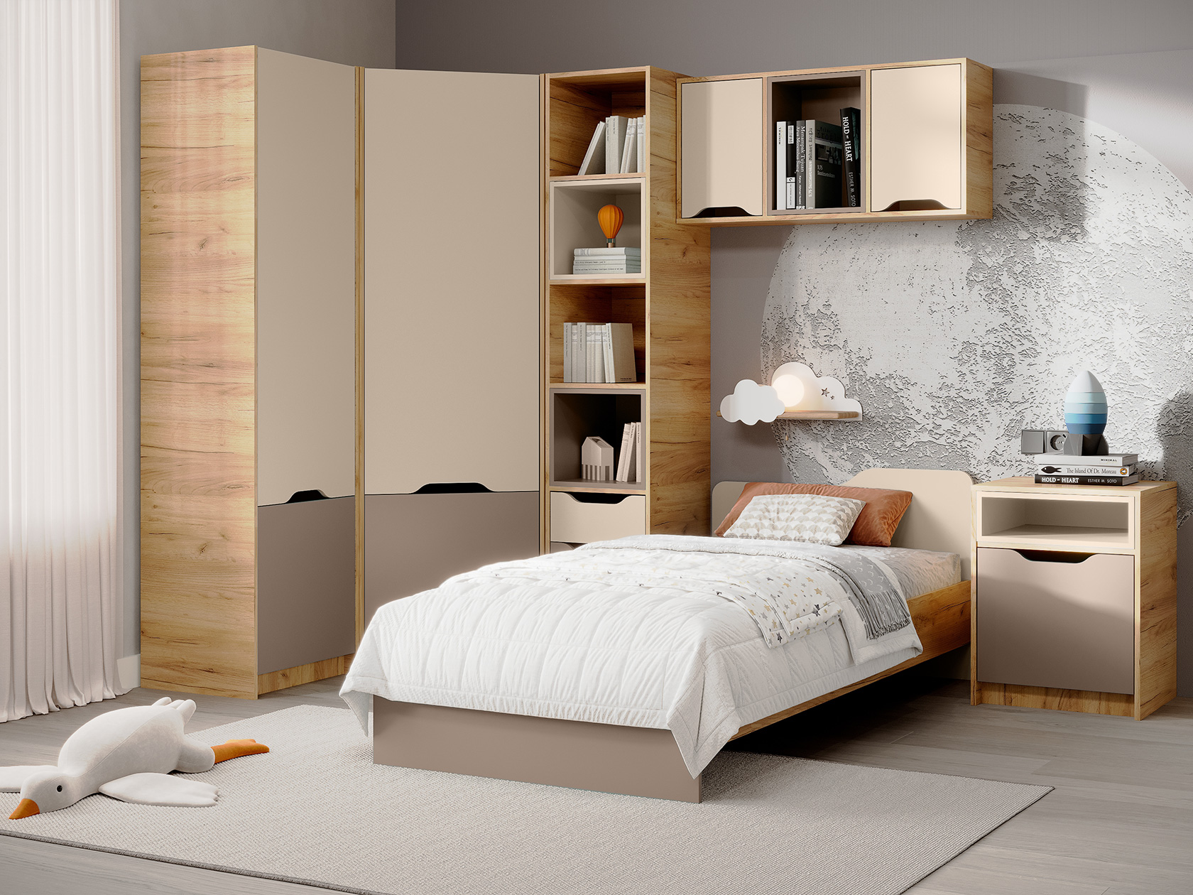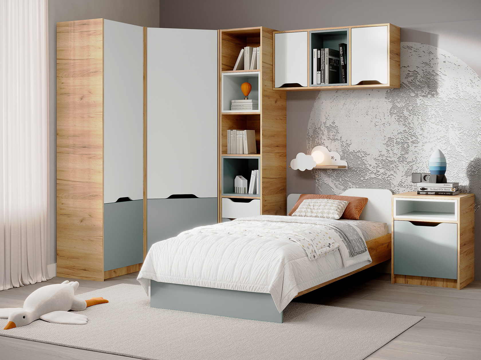 Разноплановые отделения для хранения позволят разместить книги, декоративные элементы и учебные принадлежности. Кровать с устойчивой конструкцией и высоким изголовьем обеспечит комфортный сон. Ручки на фасадах заменены удобными прорезями, которые создают стильные акценты интерьера.