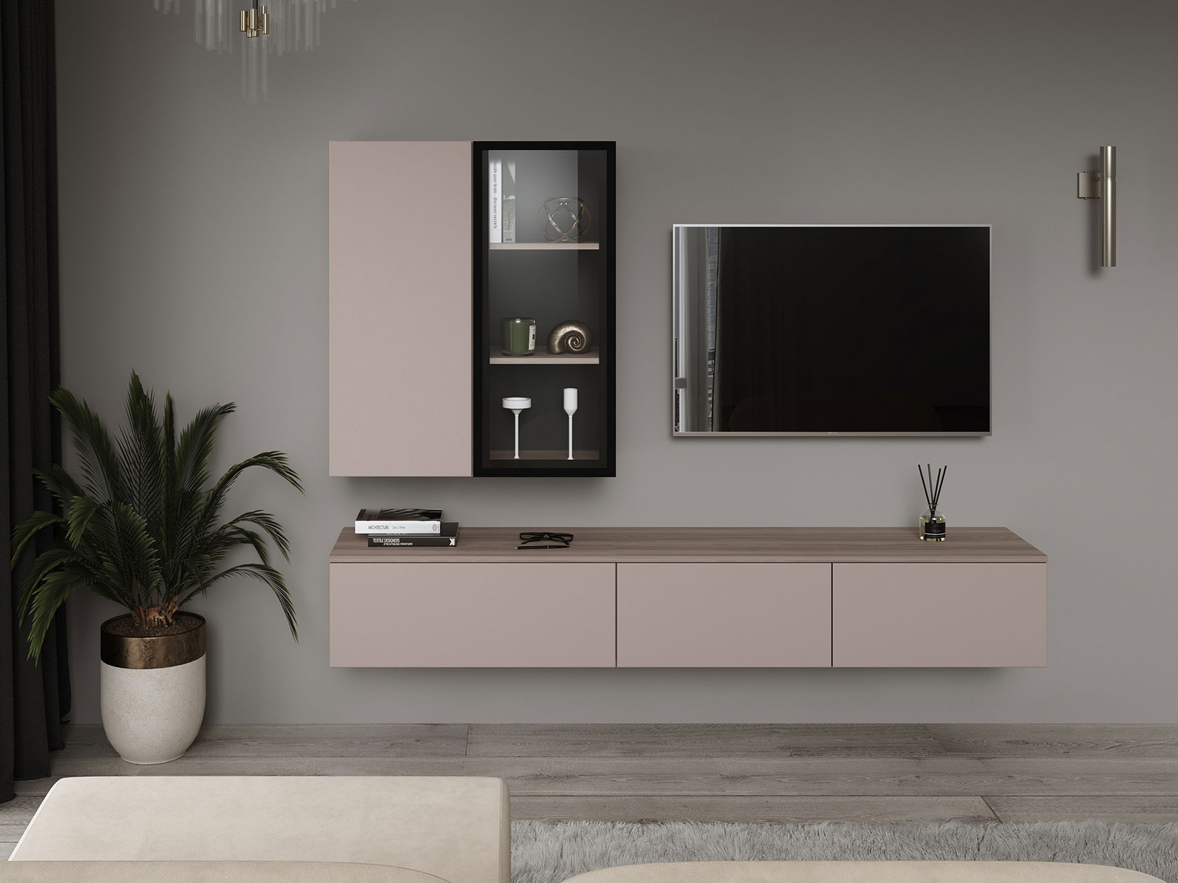 Практичный набор мебели позволяет обеспечить место для телевизора, личных вещей, книг и предметов декора. Подвесные элементы экономят полезную площадь и помогают создать обстановку в трендах минимализма.