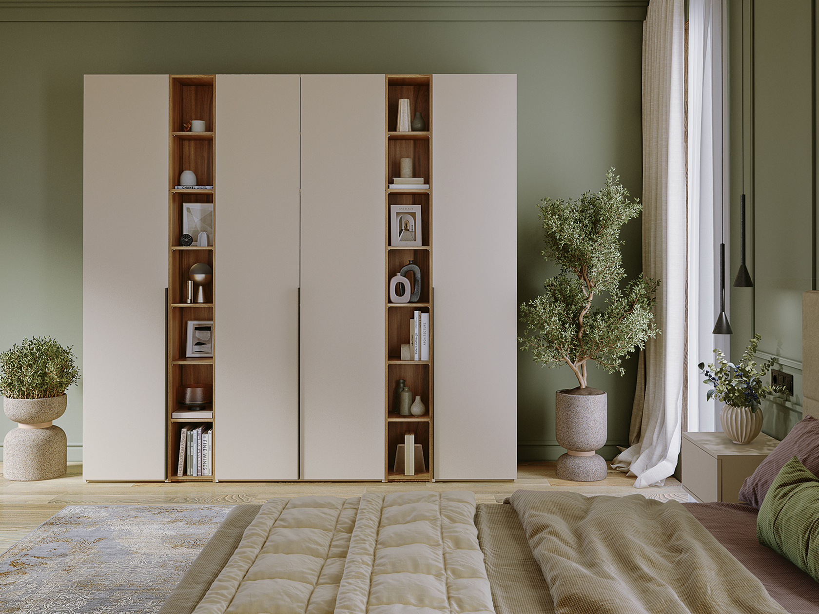 Конструкция разделена на функциональные зоны: штанги для одежды, просторные полки, выдвижные ящики и открытые ниши для аксессуаров и декора. Благодаря продуманной организации мебельный ансамбль подходит для хранения не только предметов гардероба, но и постельных принадлежностей, пледов, шляпных коробок и даже небольшого чемодана.