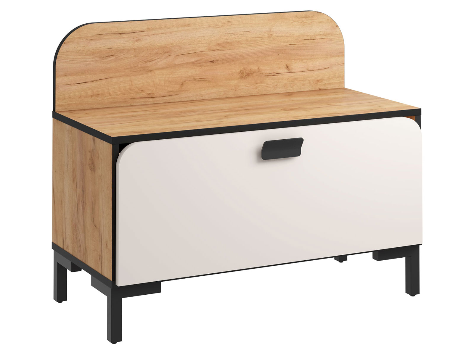 Дверца с откидным механизмом фиксируется в открытом положении. Металлические опоры гармонично сочетаются с текстурой дерева, добавляя интерьеру уютные акценты.